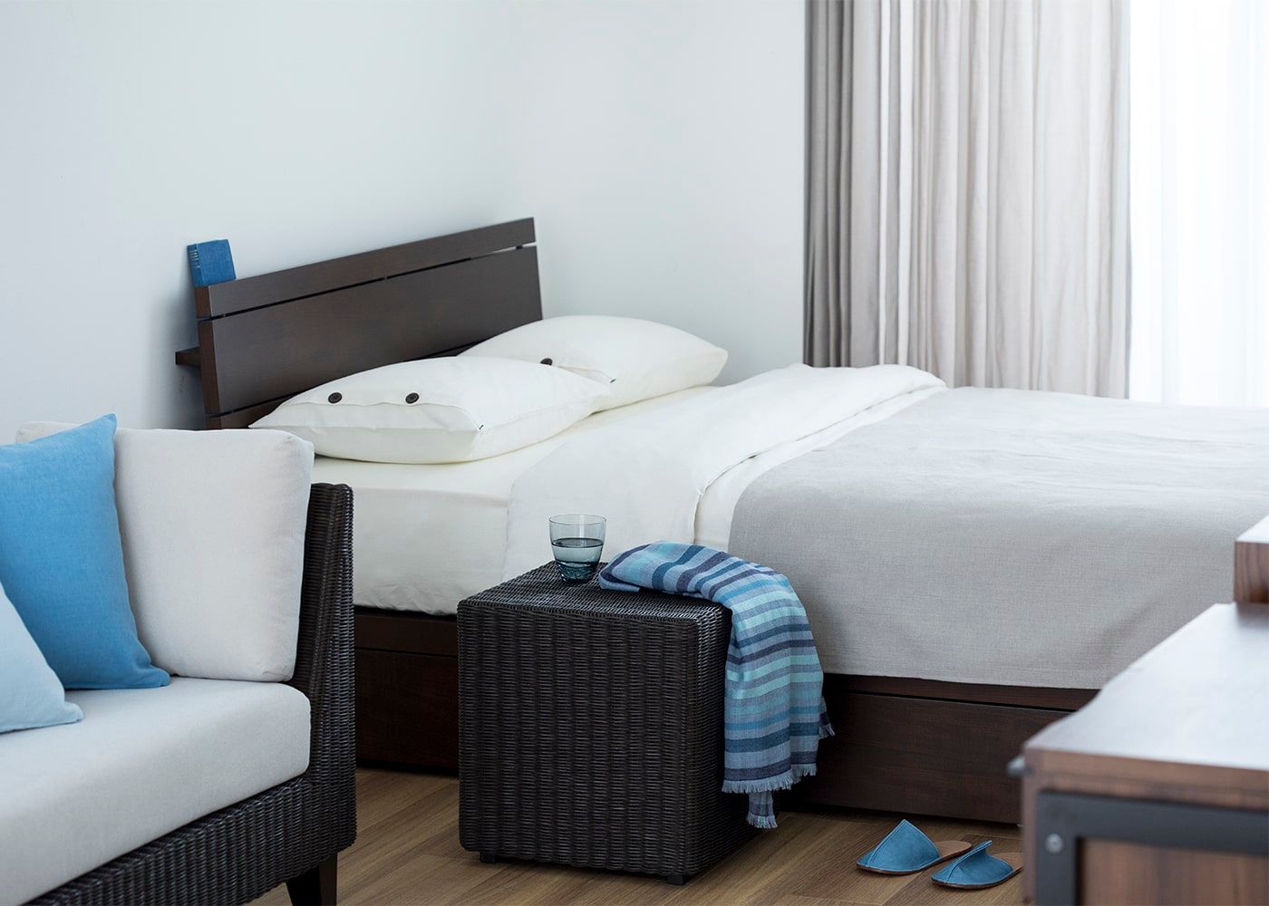 キューブ・スツール&テーブルをワンルームのベッド脇に配置したコーディネート例。一人暮らしなどのコンパクトな空間では、テーブルやスツール兼用になるアイテムがあることで、効率の良いレイアウトを組むことができます。