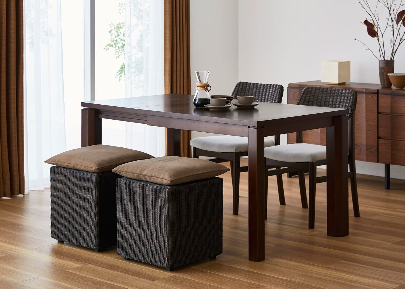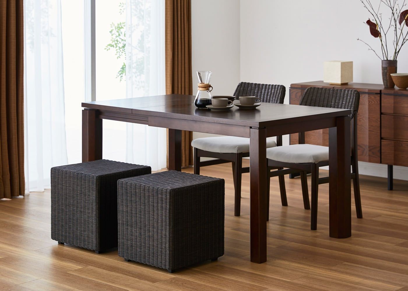 伸長式タイプや4人掛けダイニングテーブルの場合は、更にもう一つスツールがあればベンチ感覚でも使えます。ダイニングチェア同等の高さ425mmに設計しているため、丁度良い高さです。