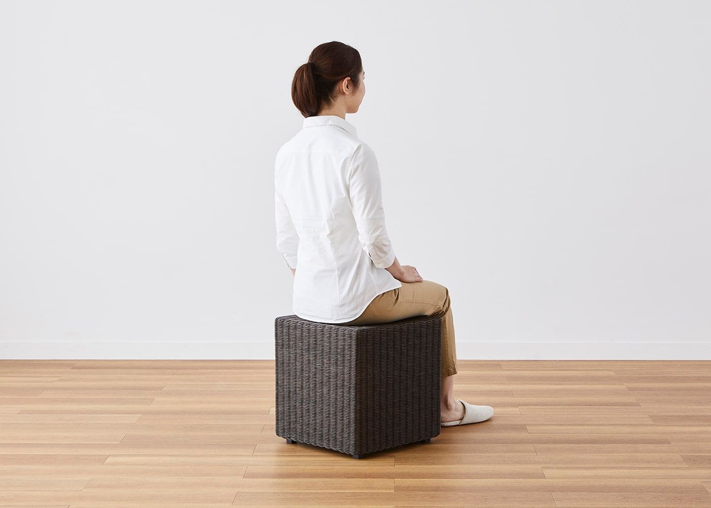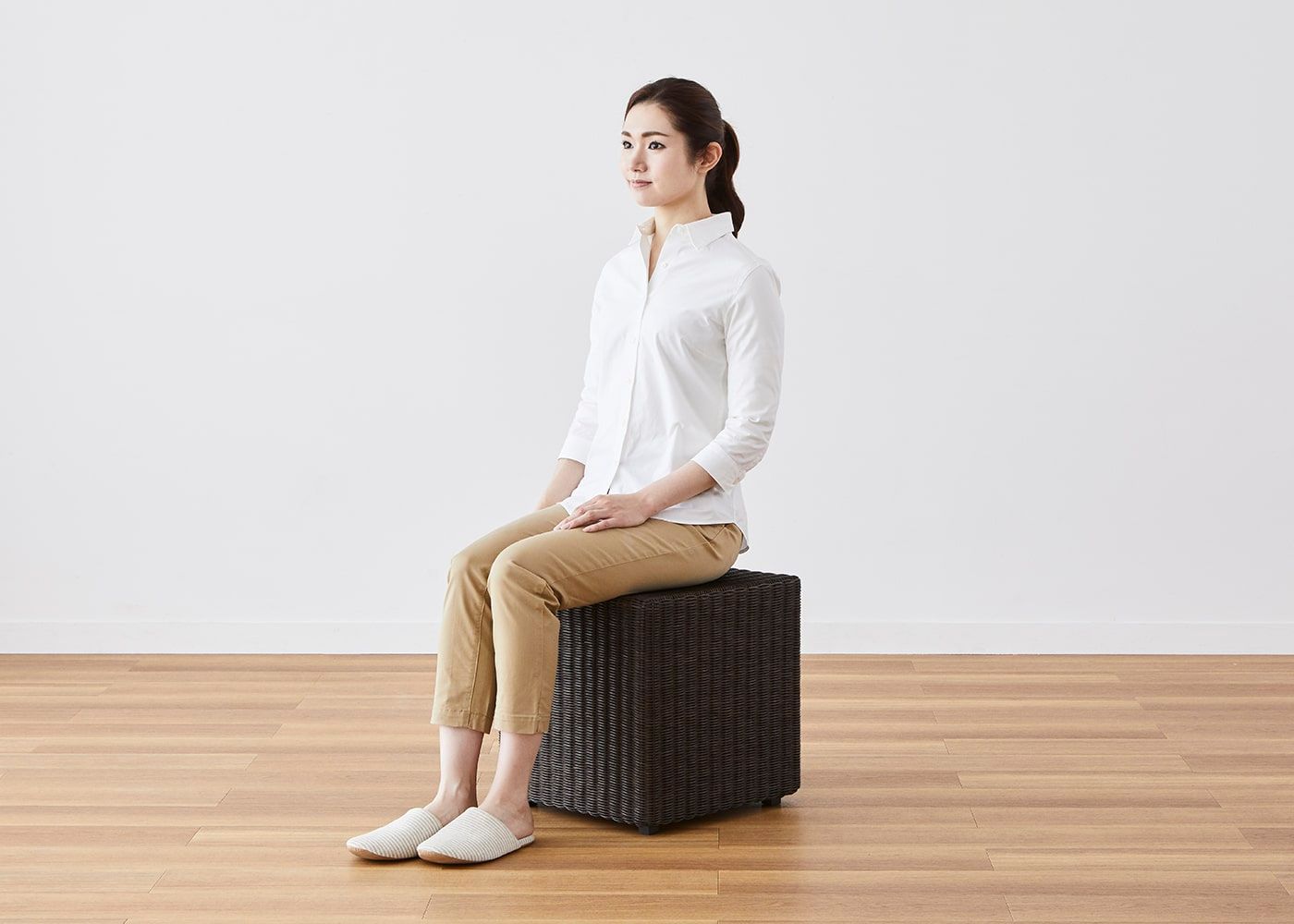 ダイニングテーブルと合わせ易い、ダイニングチェア同等の座面高さ425mmに設計しました。バランスの良いキューブ形状により、安定感のある座り心地が得られます。(モデルは身長167cmの女性)