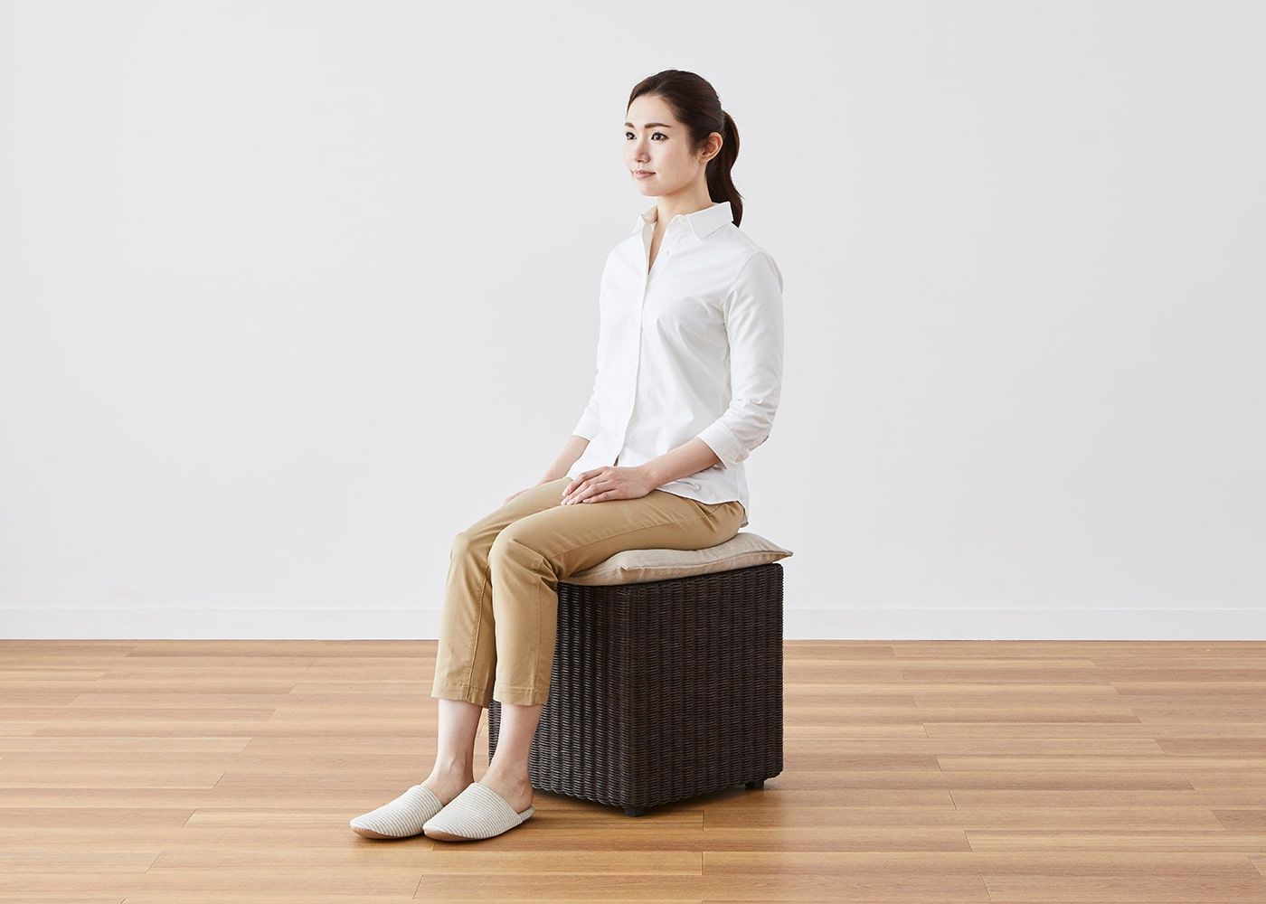 45cm角でお尻や太ももがちょうど収まるサイズ感です。座布団の中央に適度な凹みがあるため、身体にやさしくフィットします。(モデルは身長167cmの女性)