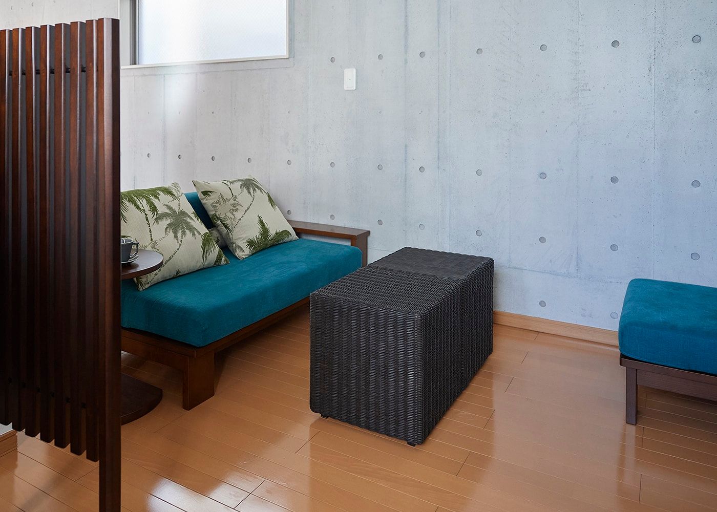 一人暮らし男性が叶えた一戸建てのアーバンリゾートなインテリア実例。ソファ背面のスペースにはラタンスツールを2台置きして、お気に入りの雑貨を飾れるスペースを作りました。