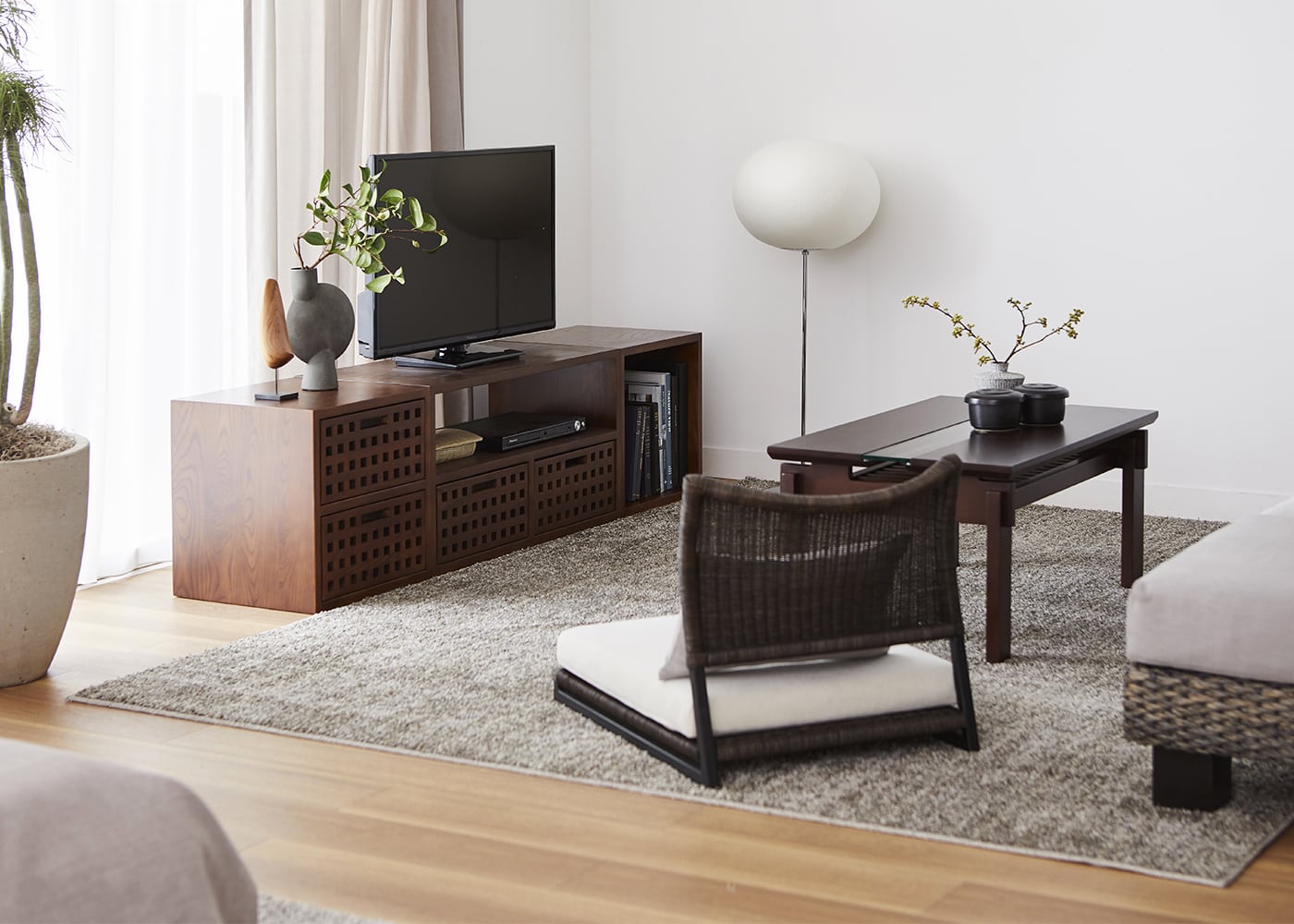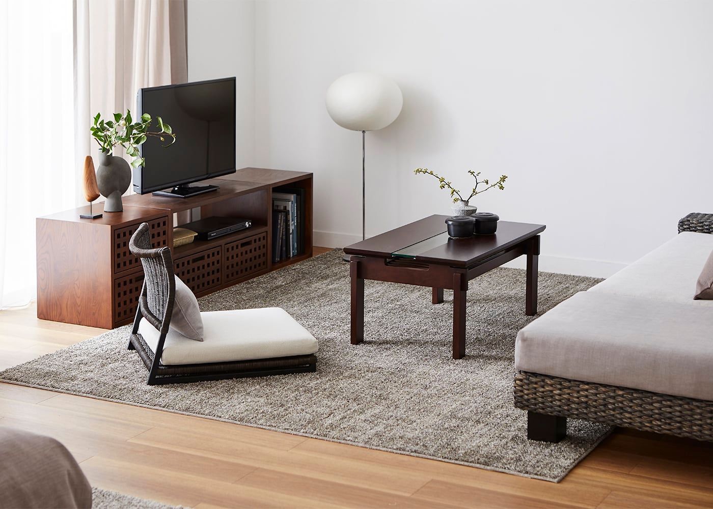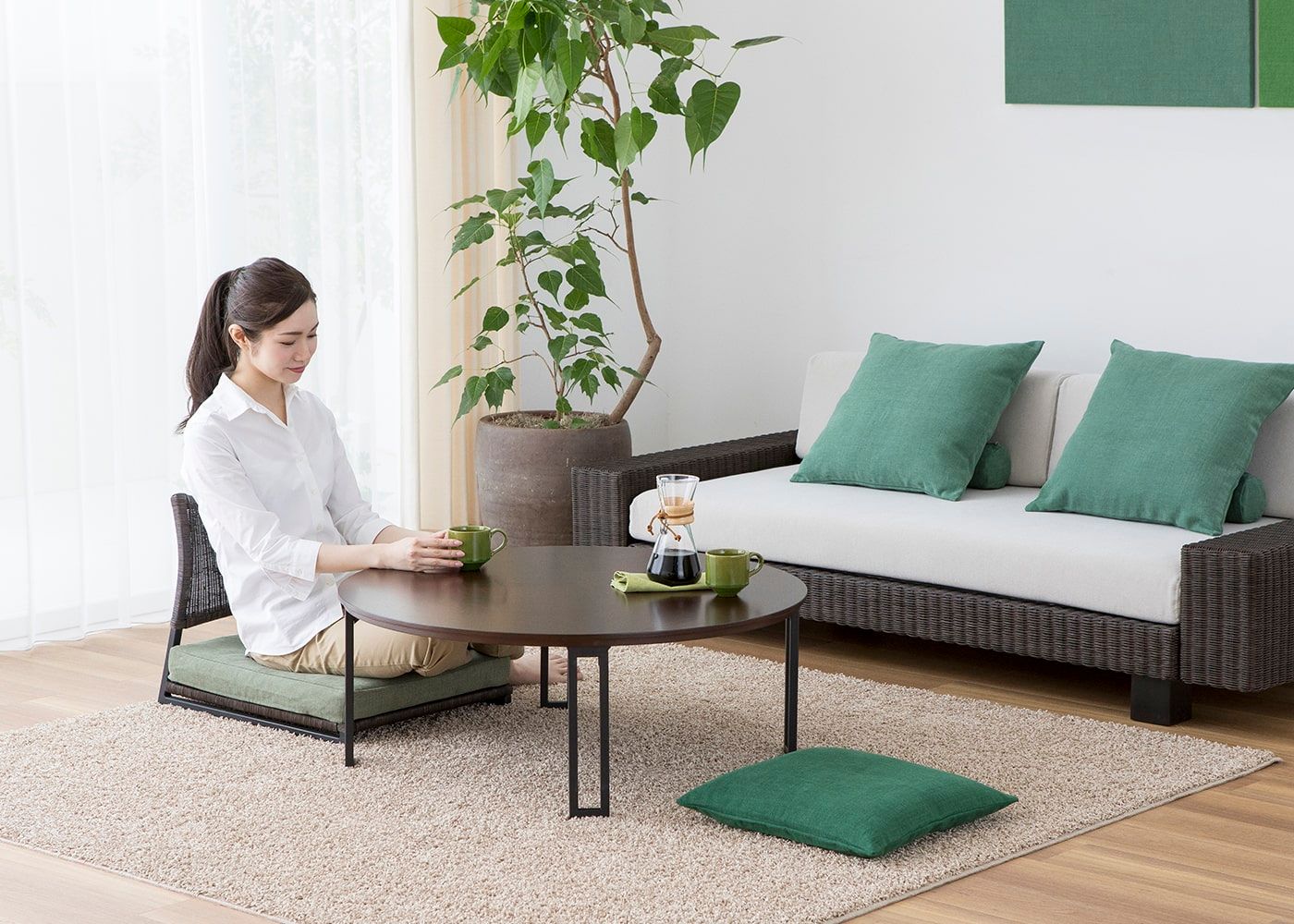 低めのサイズ感が魅力のローソファであれば、座椅子と合わせたコーディネートも可能です。同じラタン素材の