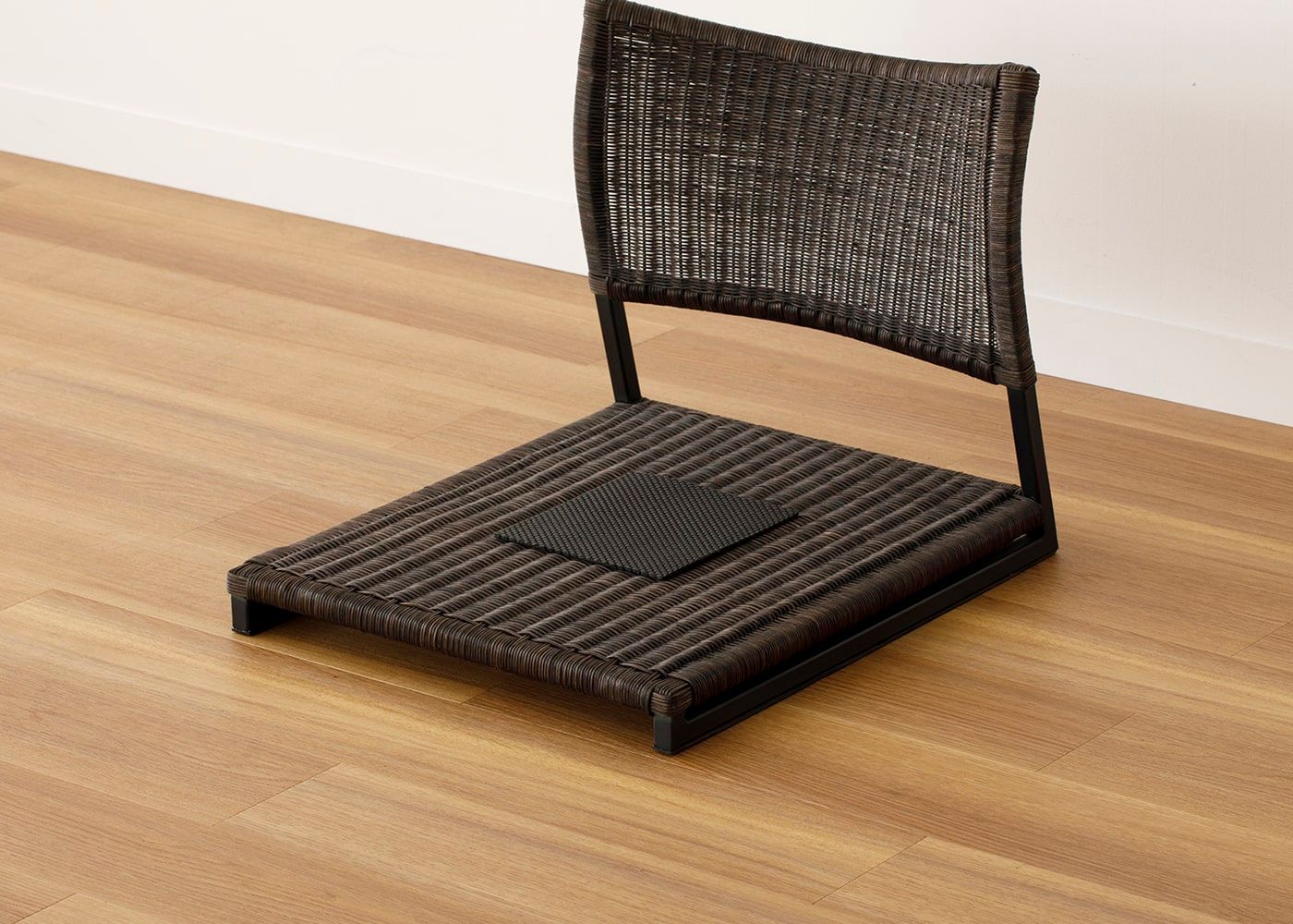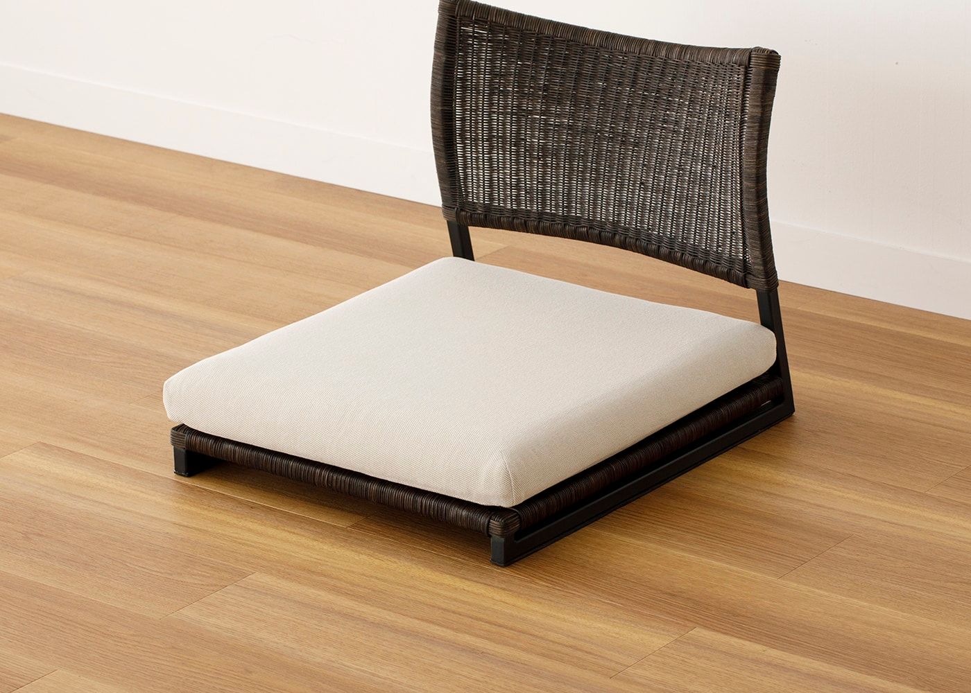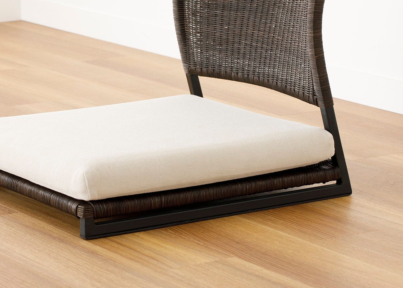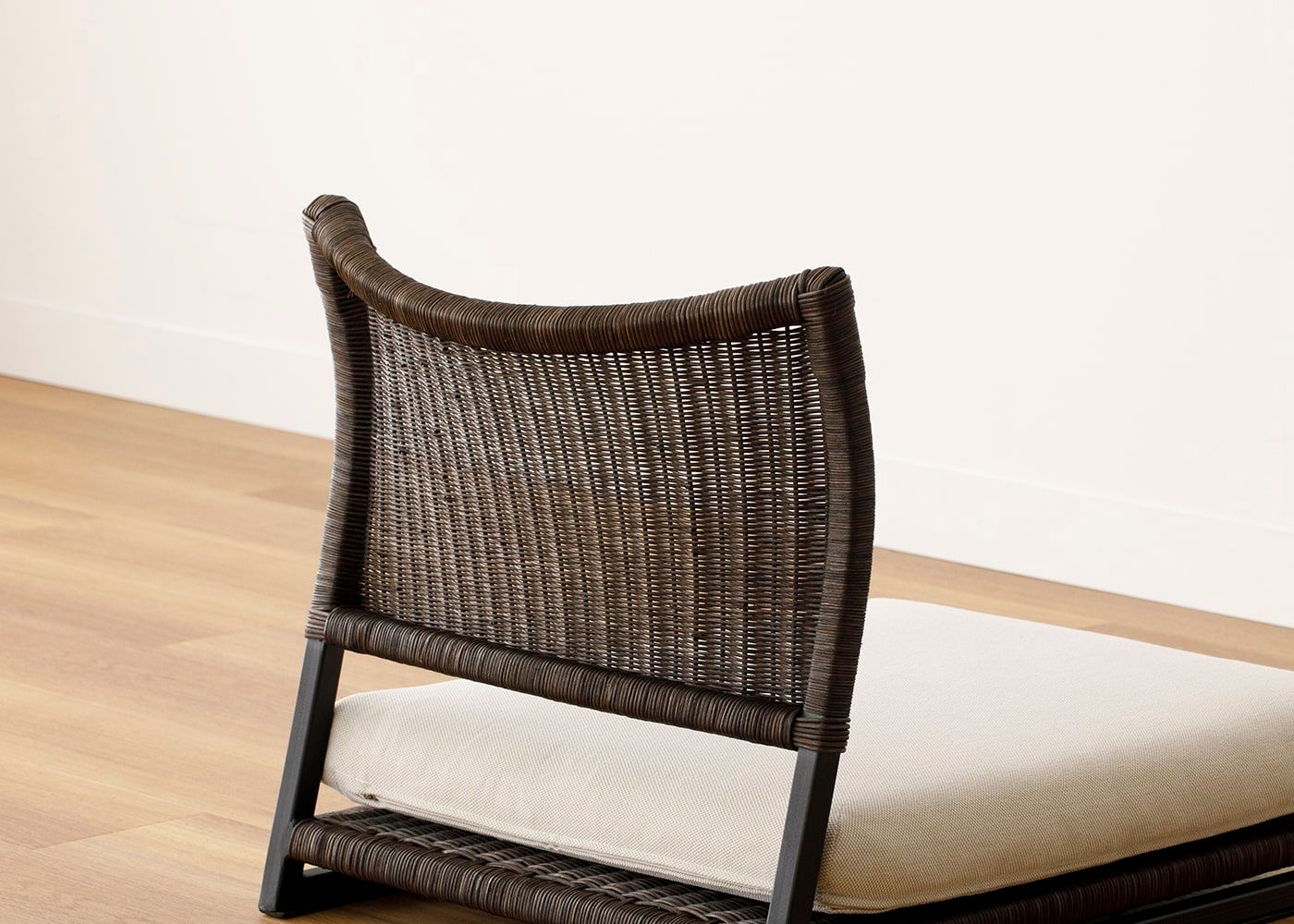 ラタンとアイアンフレームの組み合わせによる、素材の温もりとスタイリッシュなデザインが魅力の座椅子 (ラタン)。床に近い暮らしはリラックス効果が高いと言われており、ラタンの繊細な編み目や素材感によってさらに癒しの効果を高めてくれます。