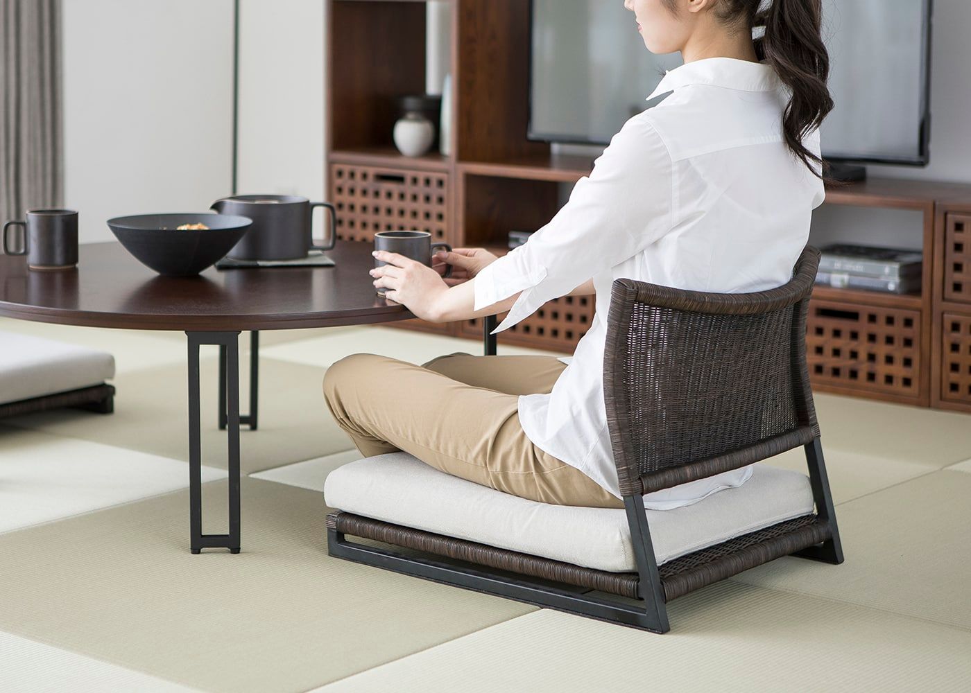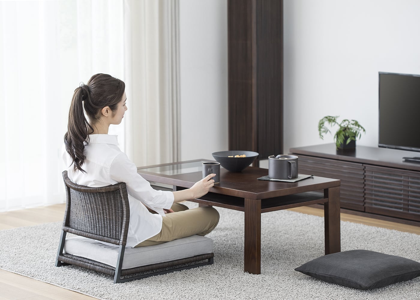 座布団を組み合わせて、ロースタイルな暮らしが実現できます。座椅子に座ってテレビを見ながらお茶や食事が楽しめます。(写真は幅1000mmのローテーブル。モデルは身長167cmの女性)