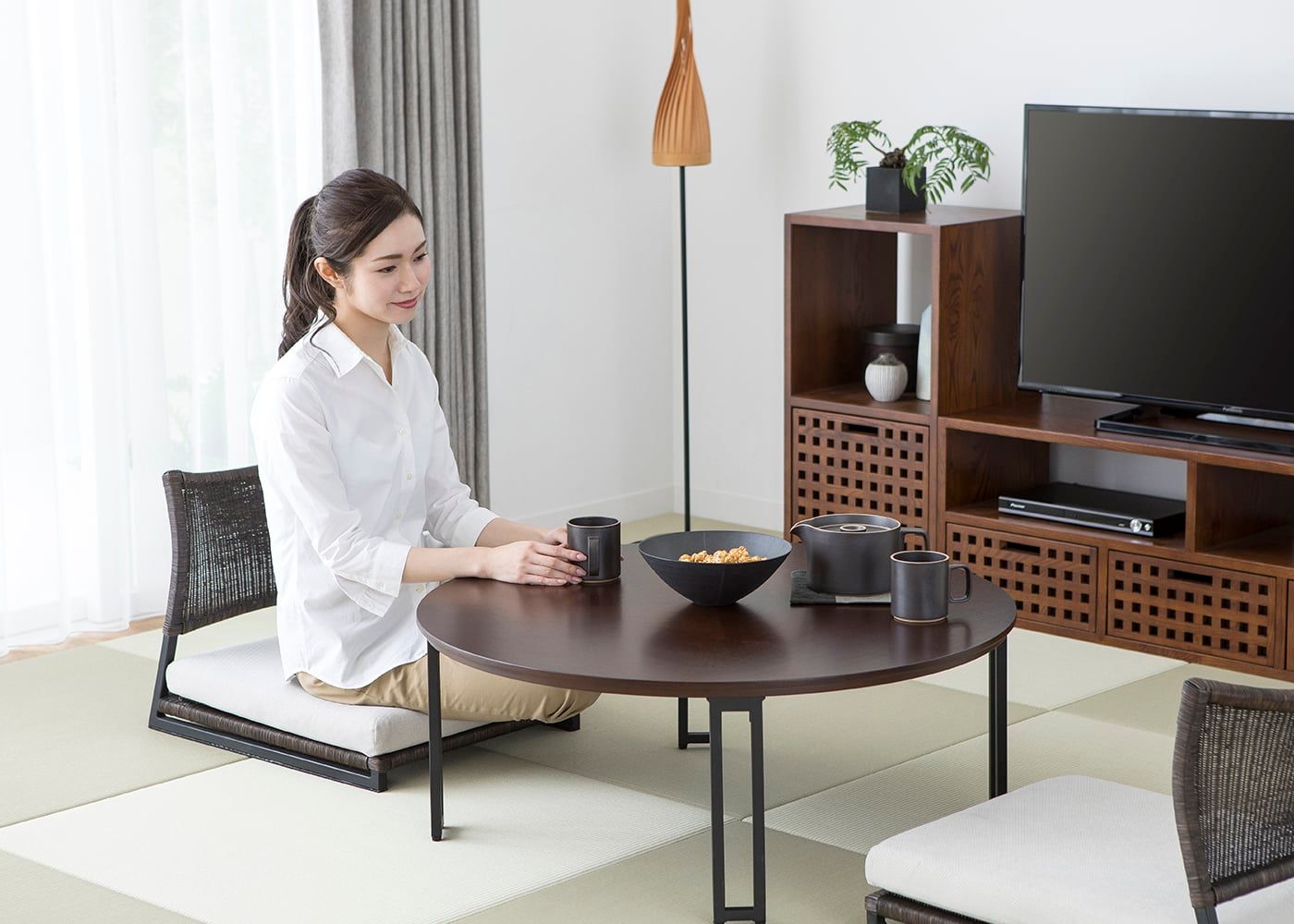ラウンド・ローテーブルと一緒にリビングに置くだけで、来客などで大人数が集まった時に床に座ってみんなで囲んでお茶や食事が楽しめます。座った人同士の顔が見渡せるため、家族・友人と食事や会話を楽しめます。(モデルは身長167cmの女性)
