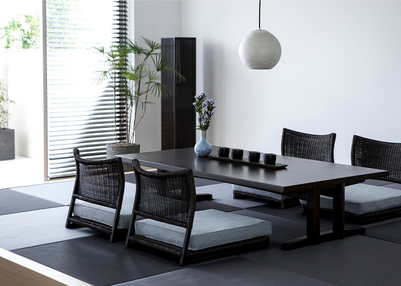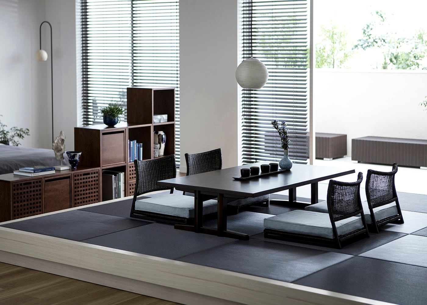 ローテーブルのスクエアなフォルムが琉球畳の市松模様がリンクすることでより洗練された印象に。この凛とした佇まいが
