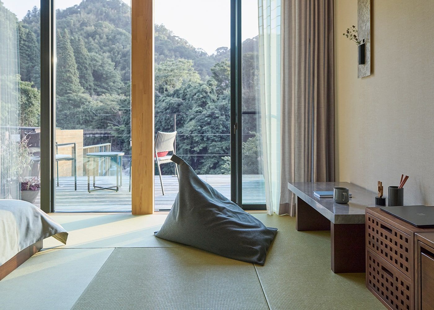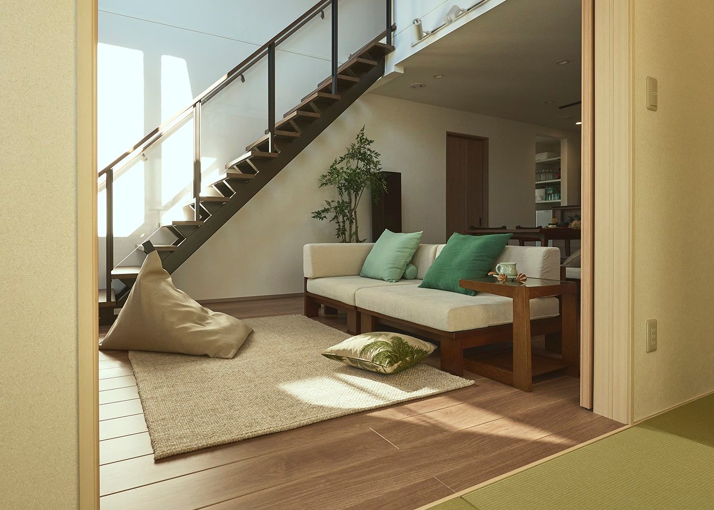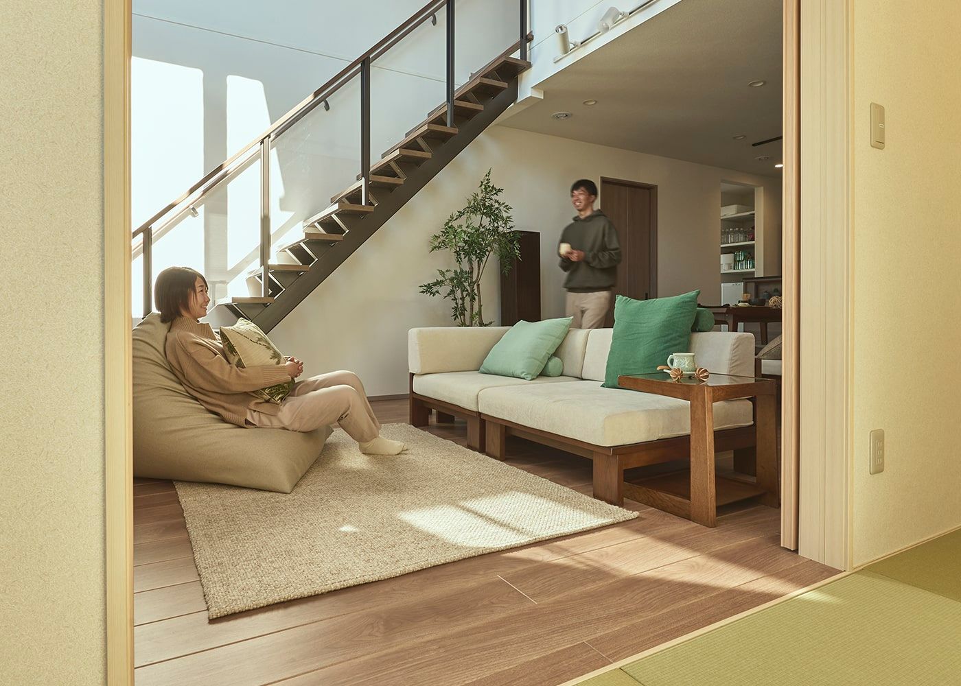 和室にグラン・ローテーブルとビーズクッションを組み合わせることで、心地よいくつろぎ空間に。床に近いことで、畳の温もりや安心感が伝わり、シンプルでまとまりのあるデザインが和の空間に調和します。