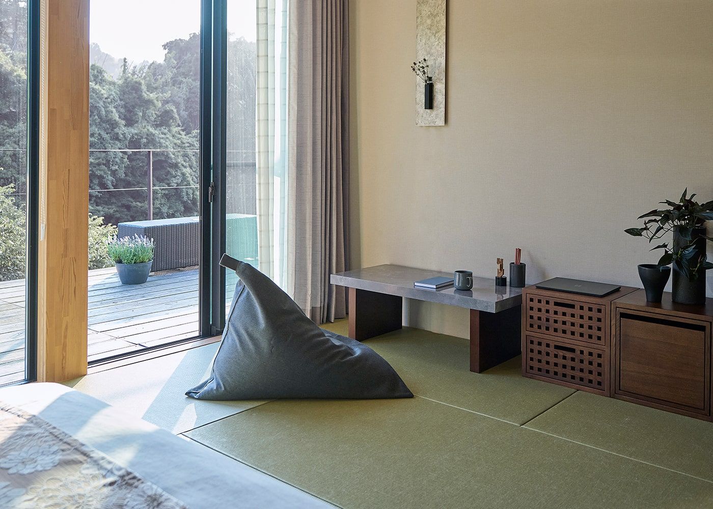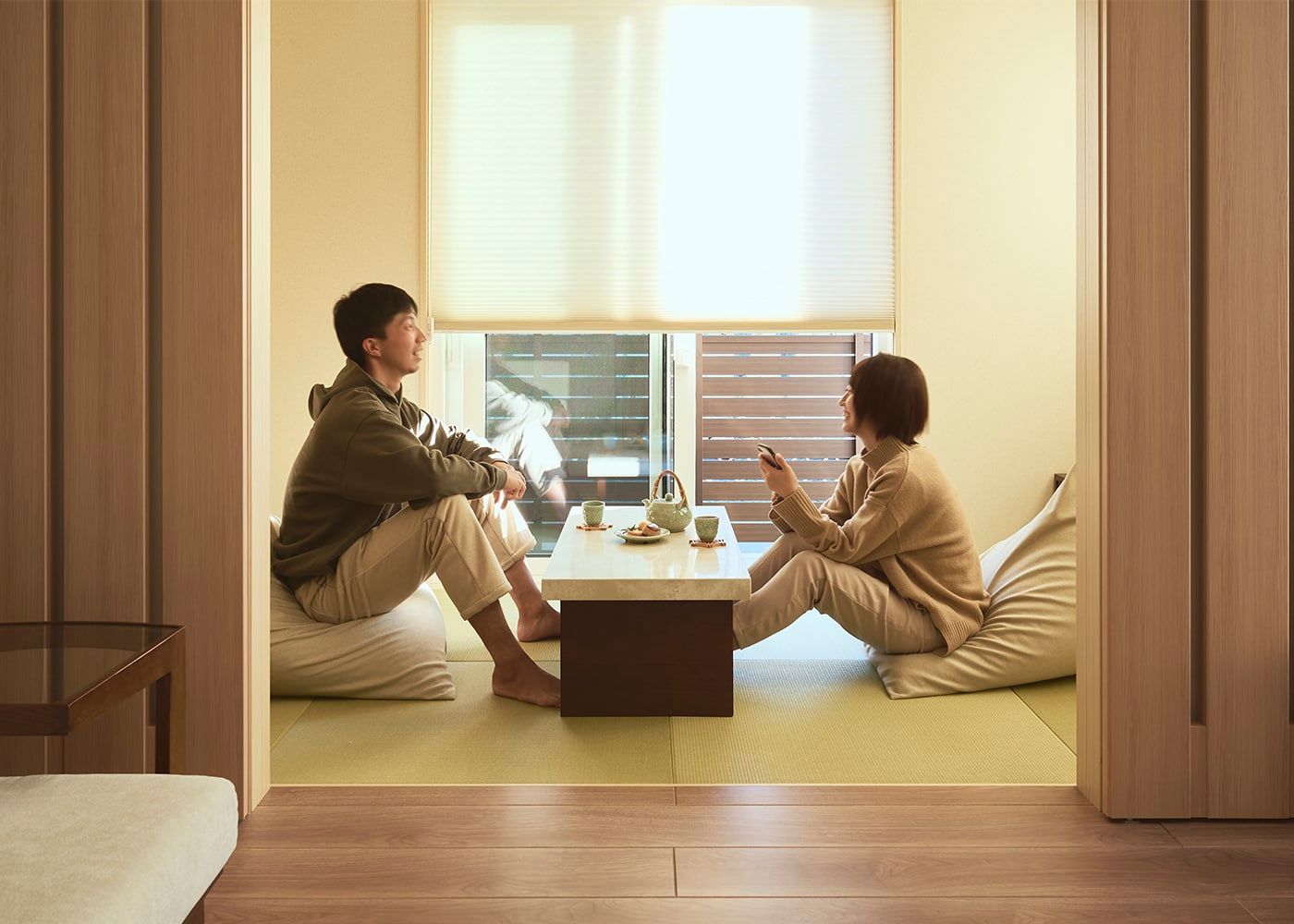 人工大理石のローテーブルと合わせることで、上質な空間を演出。重厚感のあるテーブルと体にやさしくフィットするビーズクッションが、和室の洗練された雰囲気をより引き立てます。