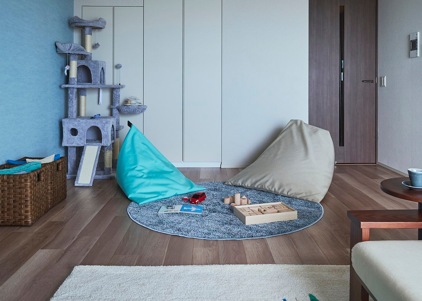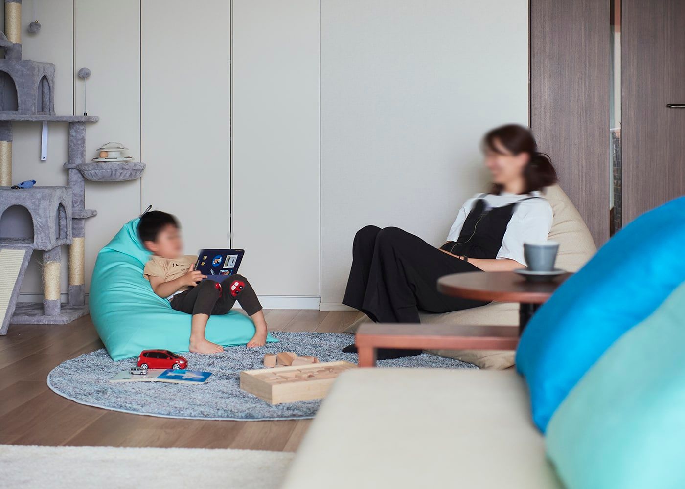 やわらかな感触に包まれながら、親子でゆったり寄り添う時間を。床に近い場所で本を読んだり、会話を楽しんだり、自然と笑顔がこぼれる団らんのひとときをお過ごしいただけます。(写真は左からMサイズ TPミストブルー、Lサイズ TPサンド)