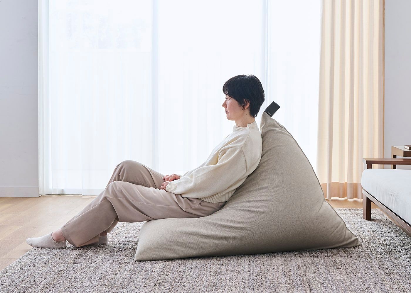 日常に寄り添い、暮らしに溶け込むビーズクッション。カバーは多彩なカラーバリエーションと高い機能性を兼ね備えた、テンポテスト生地を使用。使う人に合わせた最適な座り心地を提供します。(写真はLサイズ TPサンド)
