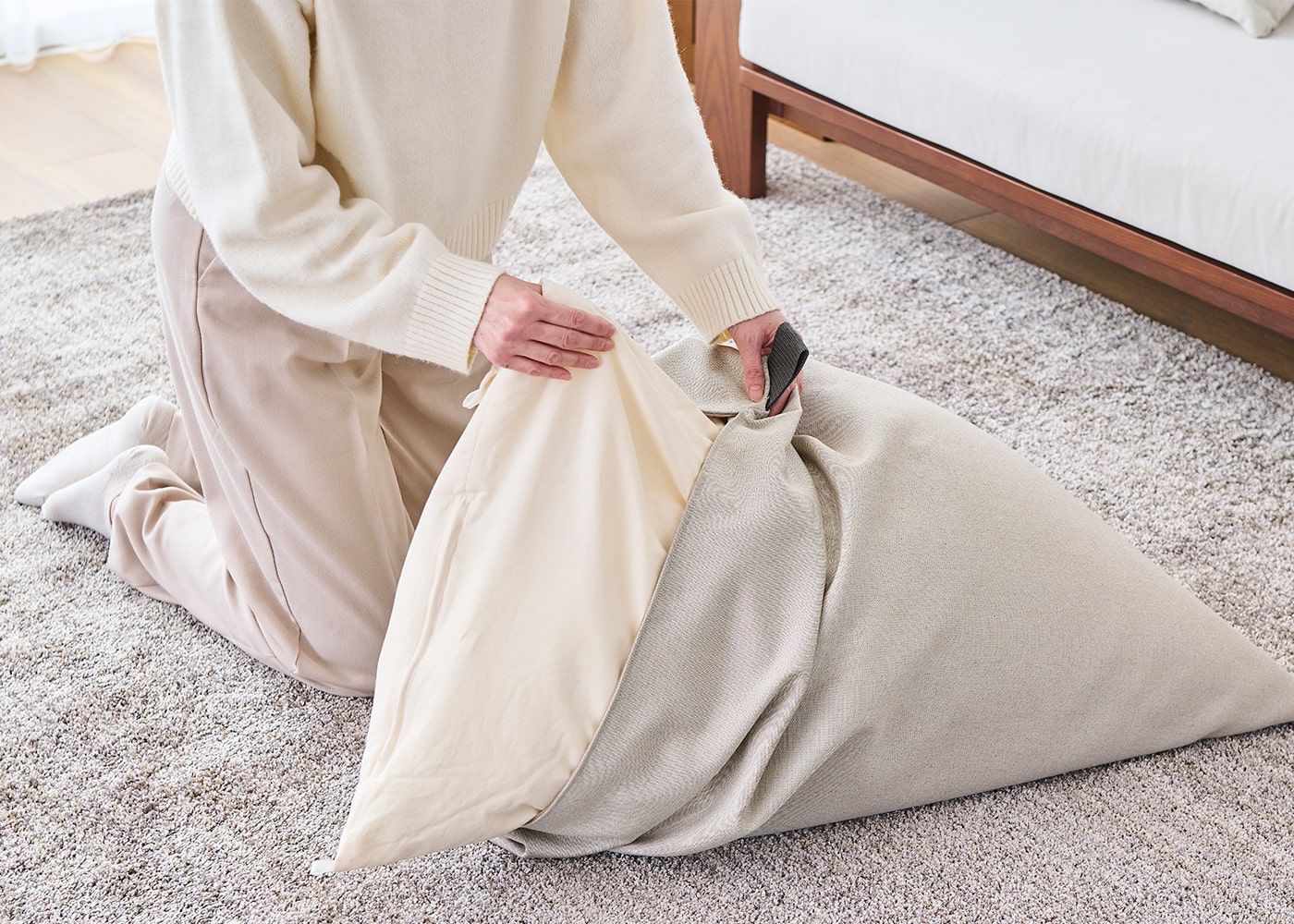取り外しができるカバーは、ファスナー式で中材の出し入れもスムーズ。カバーを交換すれば、お部屋の雰囲気や季節に合わせて印象を変えることも可能です。清潔で快適な状態のまま長くお使いいただけます。