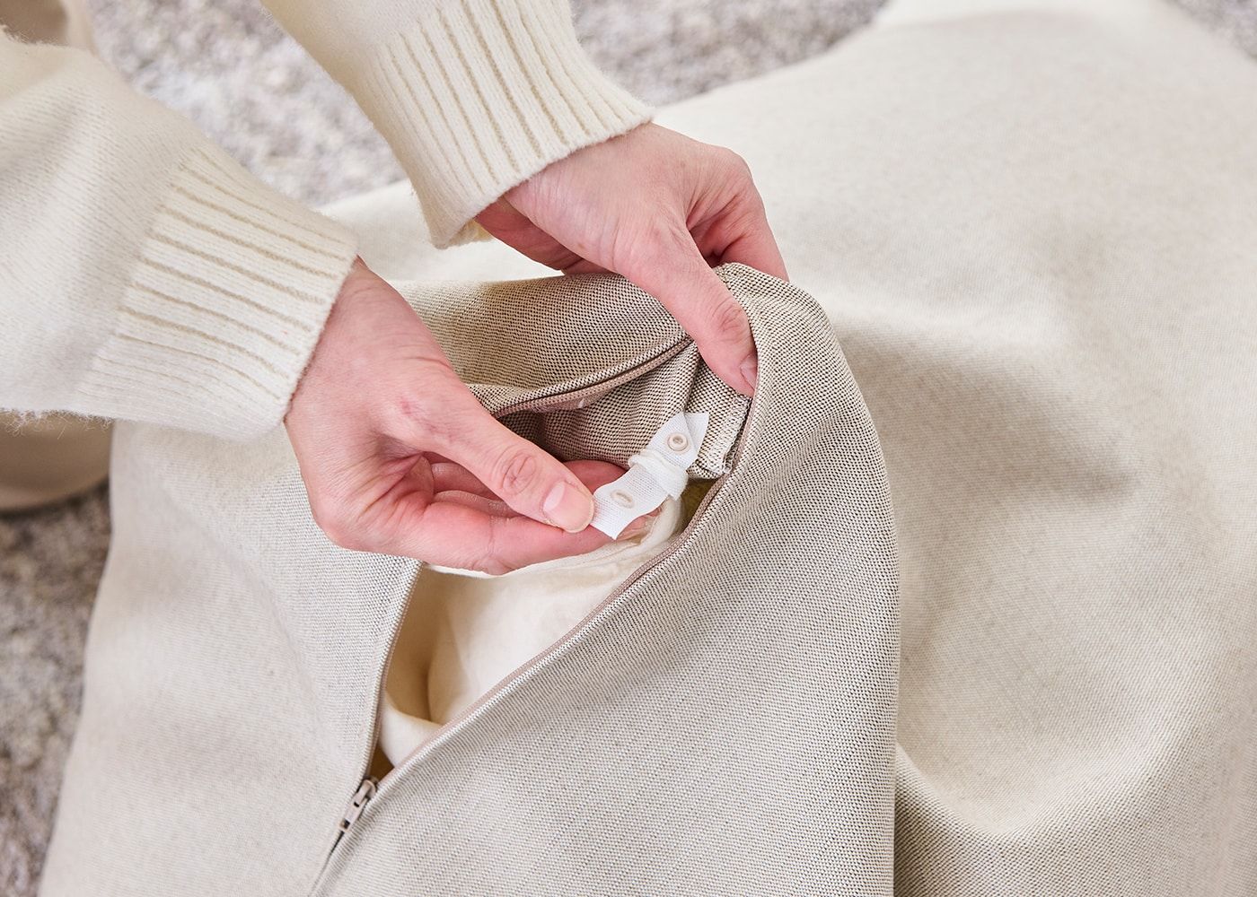 ファスナーを開けると、中材を固定できる便利なボタン付き。中材とカバーをしっかり留められるため、どの角度から座っても形が崩れにくく、安定した座り心地を保ちます。
