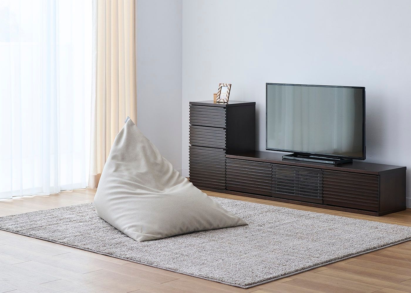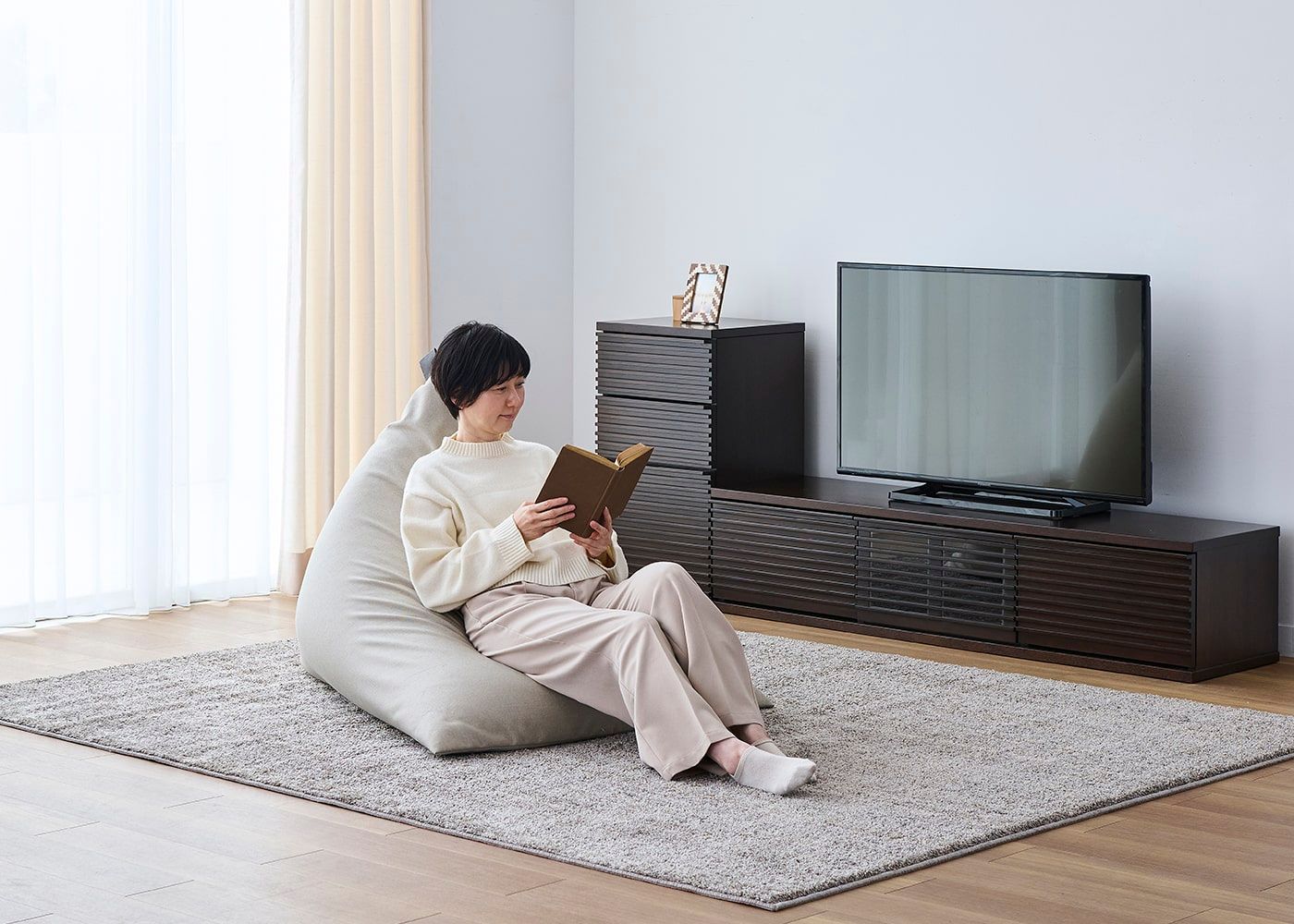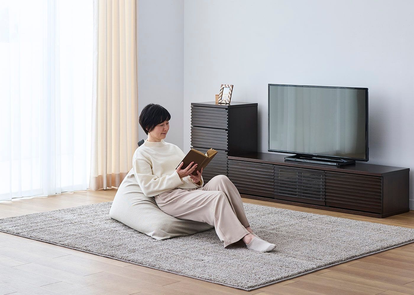 ロータイプのテレビボードを置いたリビングルームでは、ビーズクッションに座ることで丁度よい目線の高さでテレビ画面を見ることができます。映画鑑賞やゲームなどの娯楽時間を、より快適に過ごしてみてください。