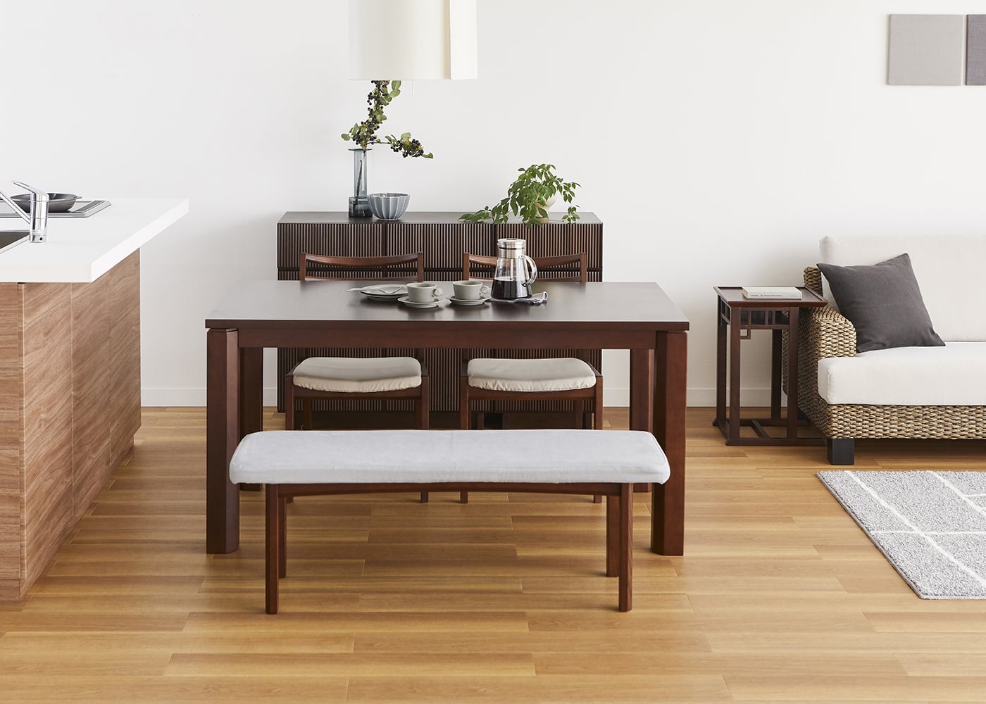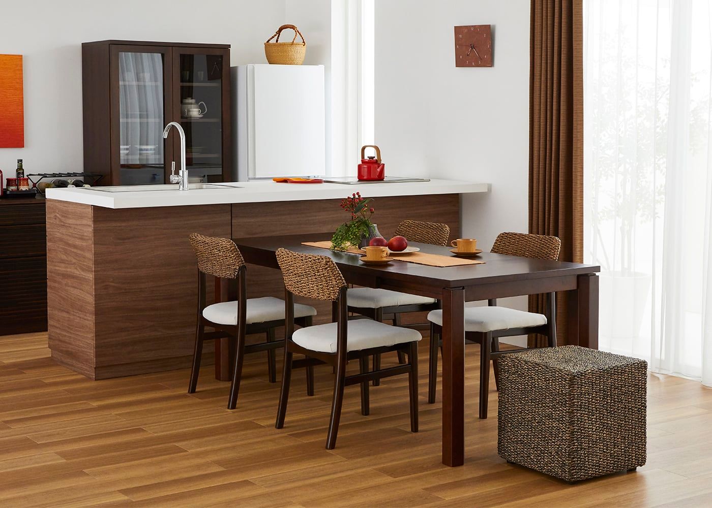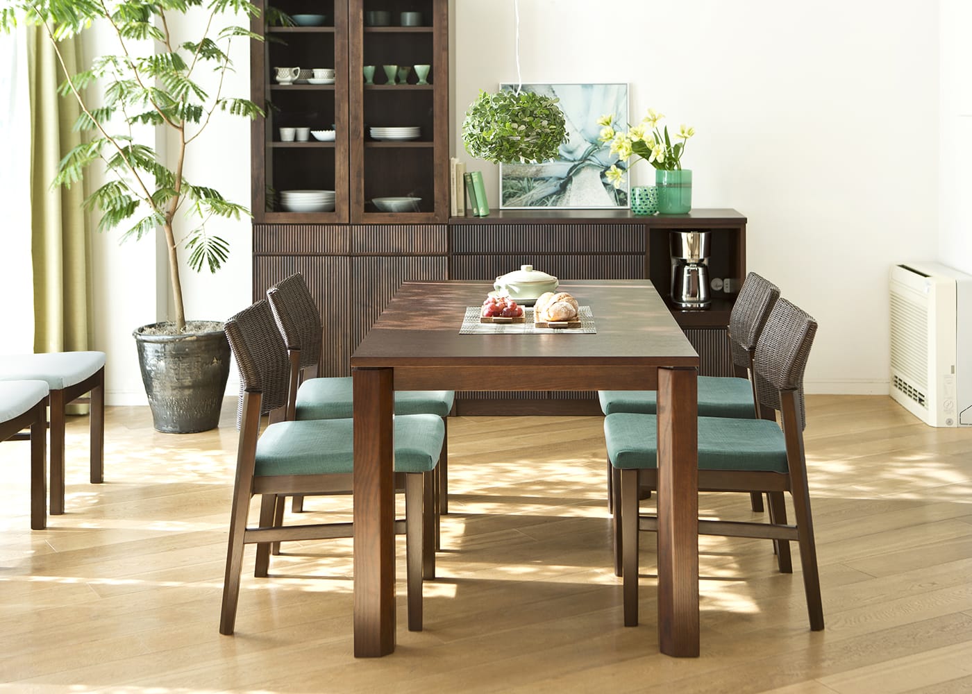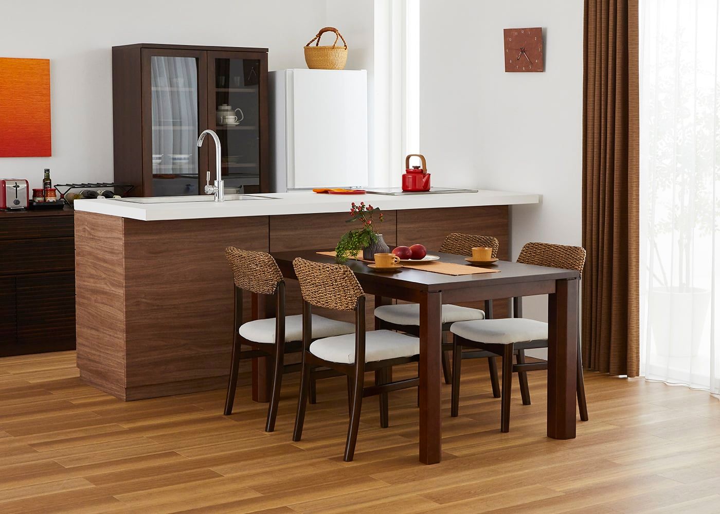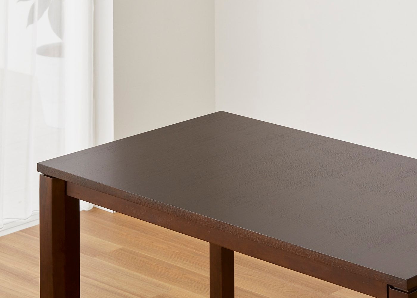 深みのある色味の天板は木材の質感を活かし、食事スペースにあたたかさを演出。また、