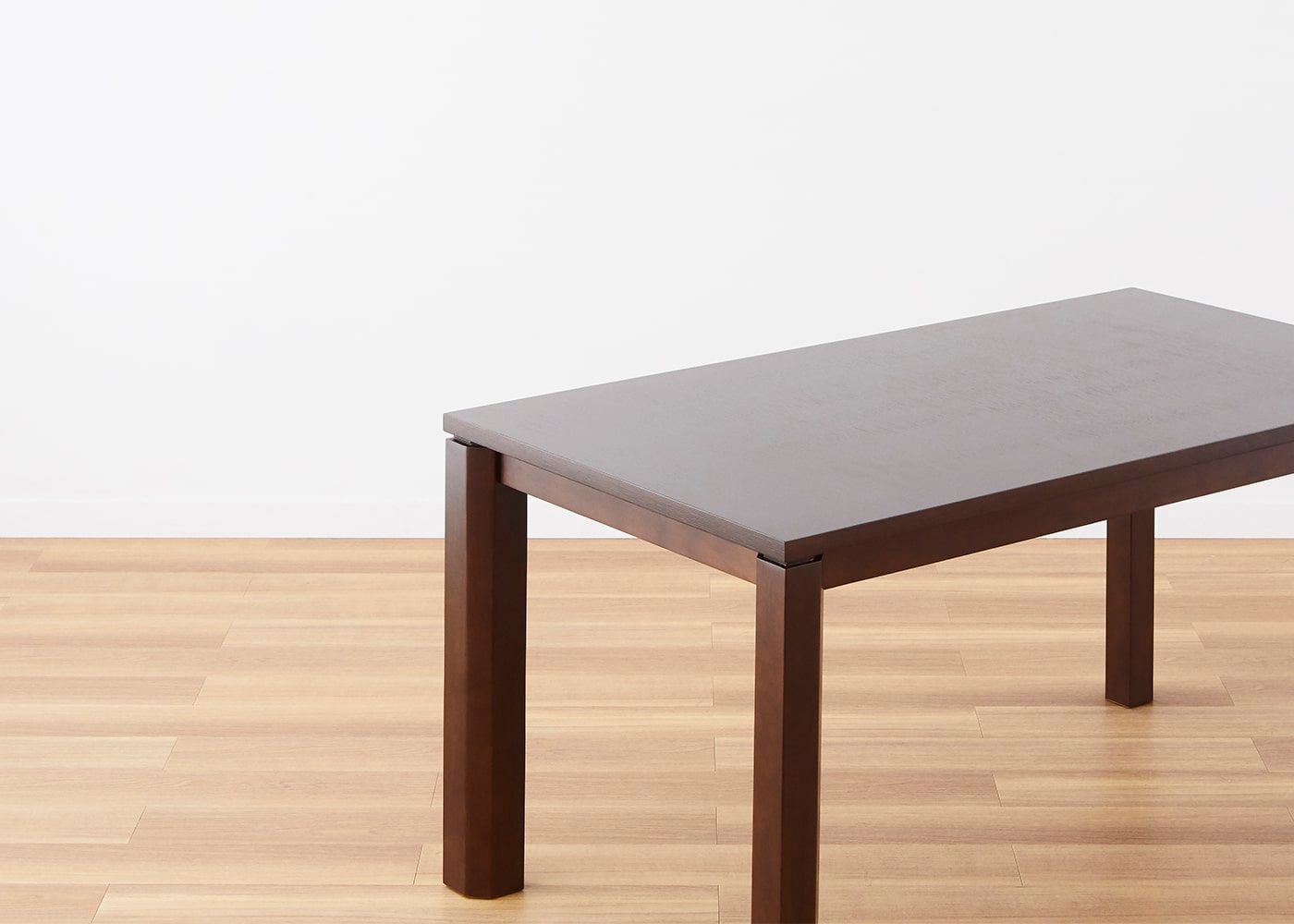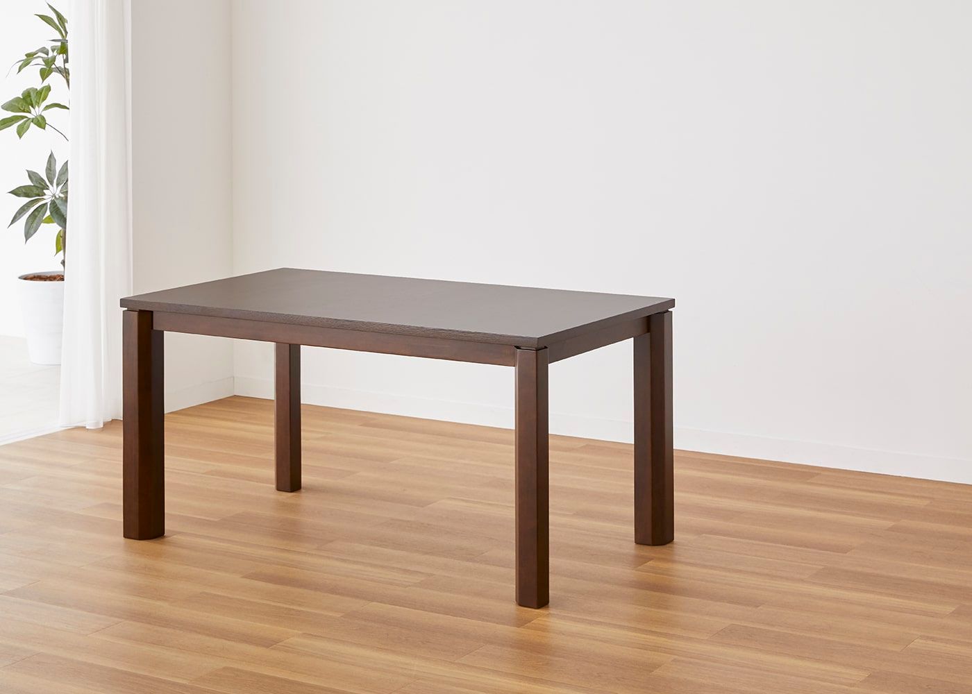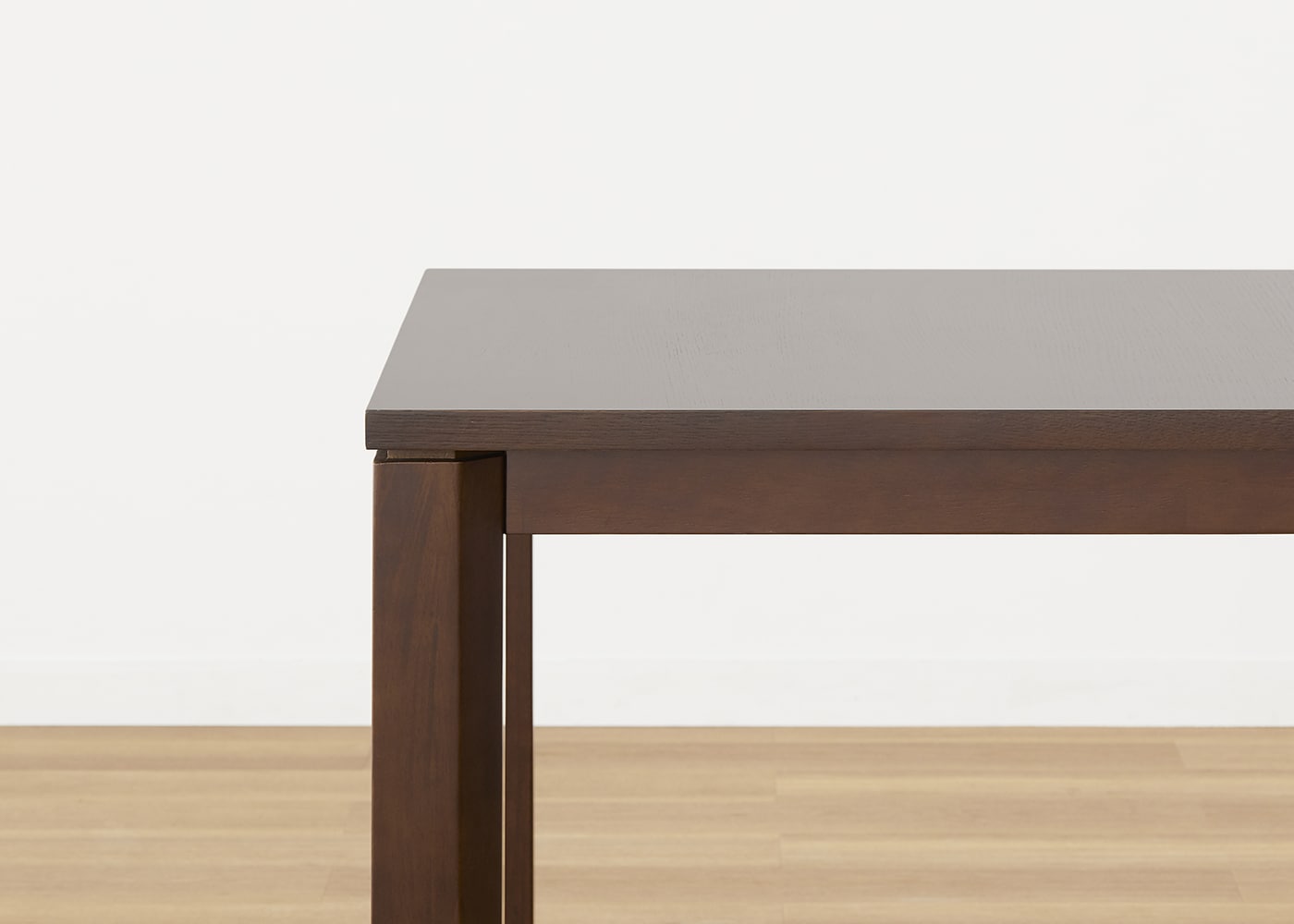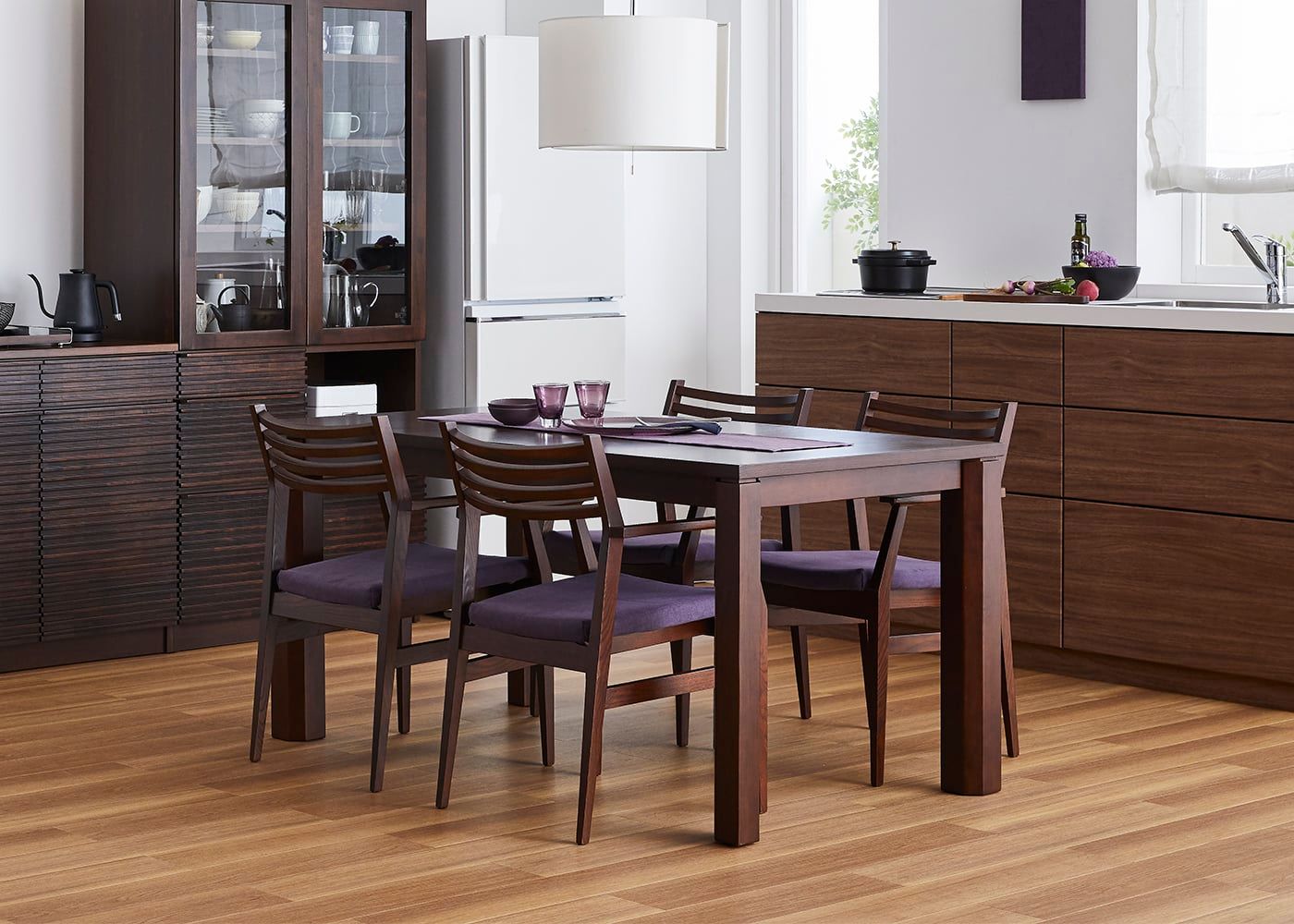 深みのある色味の天板は木材の質感を活かし、食事スペースにあたたかさを演出。また、