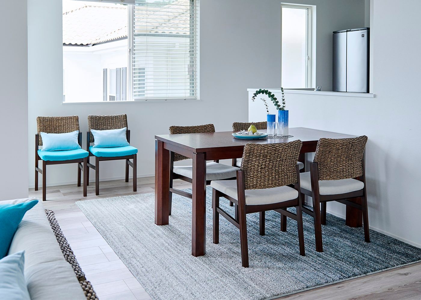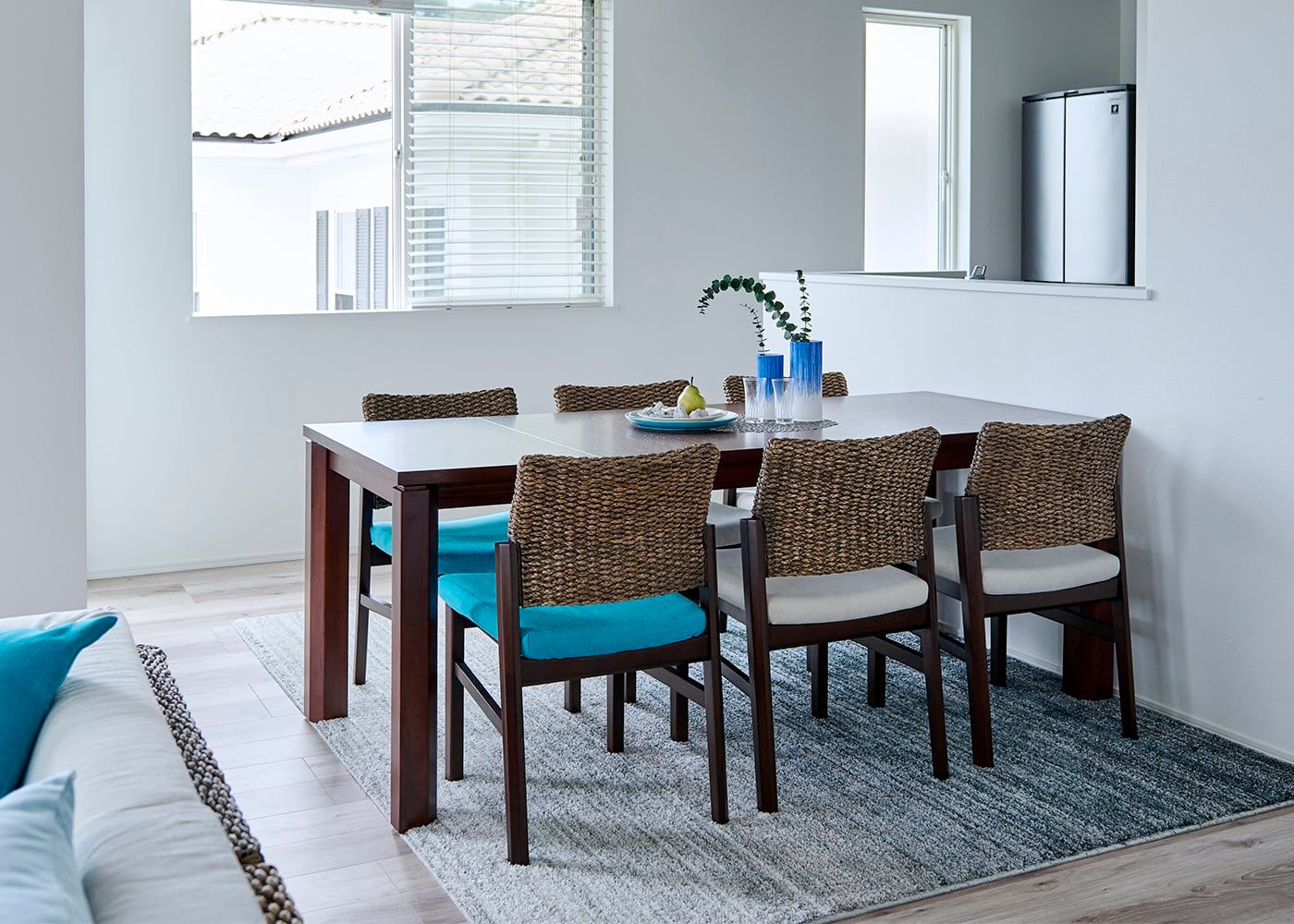 自宅のダイニングをリゾートヴィラのような雰囲気で演出したコーディネート例。空間全体がリラックスムードに包まれるグリーンでトータルコーディネートすれば、エクステンション・ダイニングテーブルの周りで心地よく過ごせるでしょう。