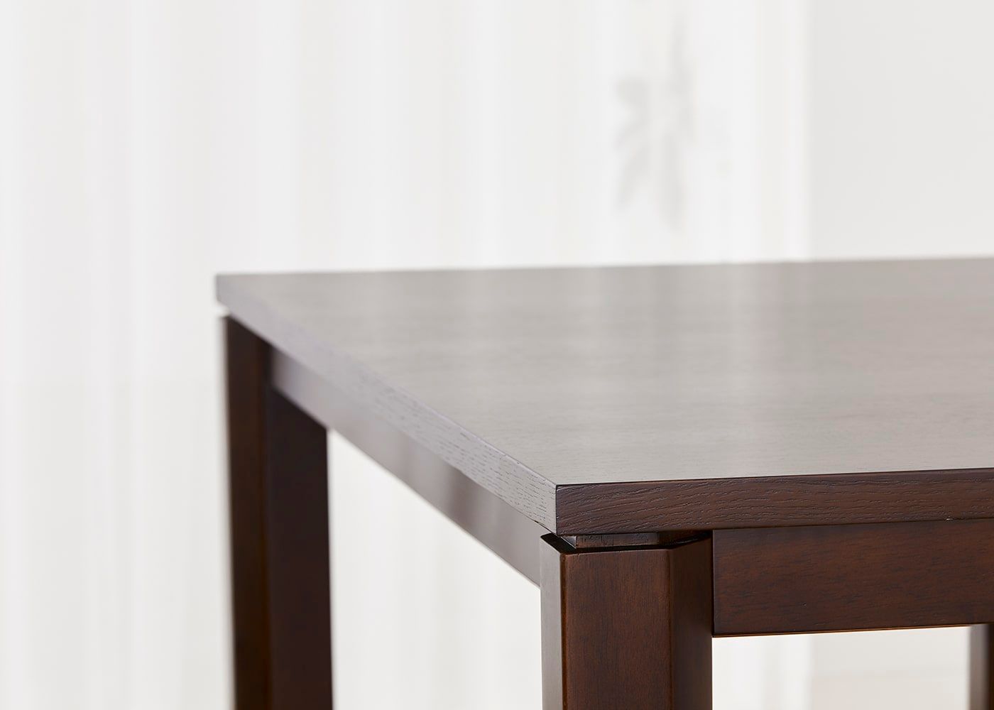 天板には真っ直ぐで繊細な木目が美しいオーク突板を使用。また、塗装には洗練感のあるダークブラウン色を採用しました。木地着色(下塗り)をしっかり行うことで木目を感じつつ、多少の傷でも色剥げが起こりにくい塗装です。