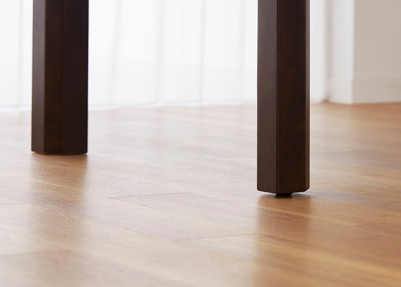 エクステンション・ダイニングテーブルv02の脚は、脚の内側をカットして美しい面を描くデザインが特徴です。伸長機能に耐えうる強度も併せ持ちながら、すっきりと見える脚を採用しました。(写真は通常時の幅1450mm)