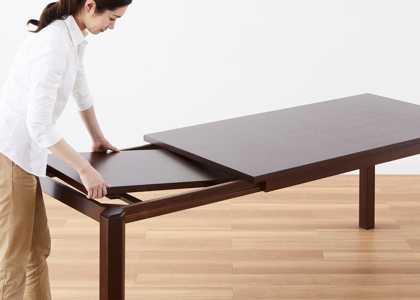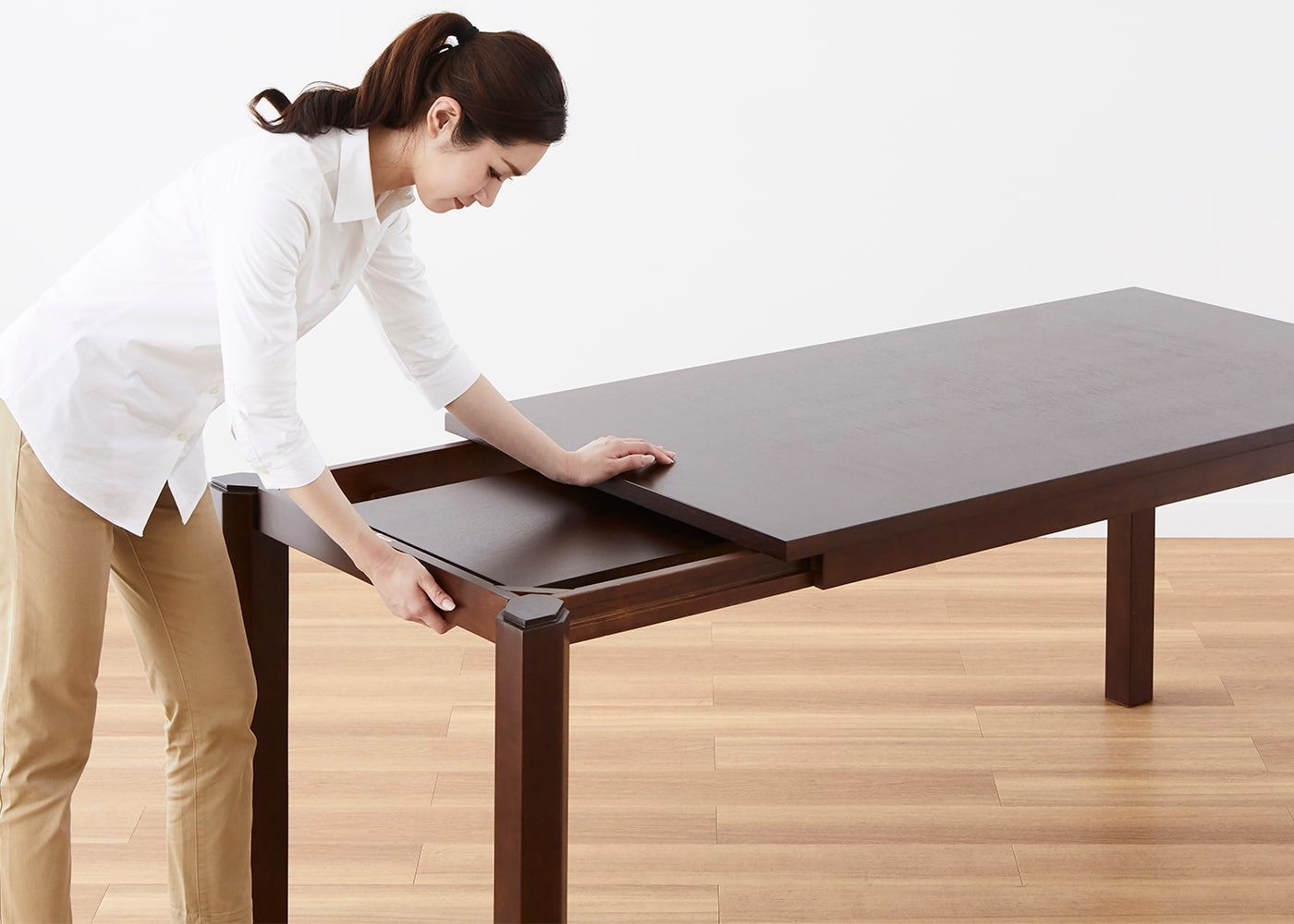 天板下に収納されている伸長天板をゆっくりと取り出しましょう。脚と一体の幕板をスライドさせることで、伸長天板が現れます。