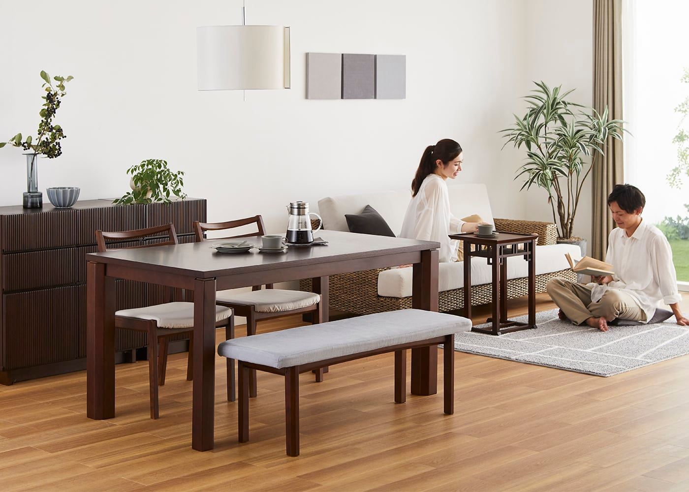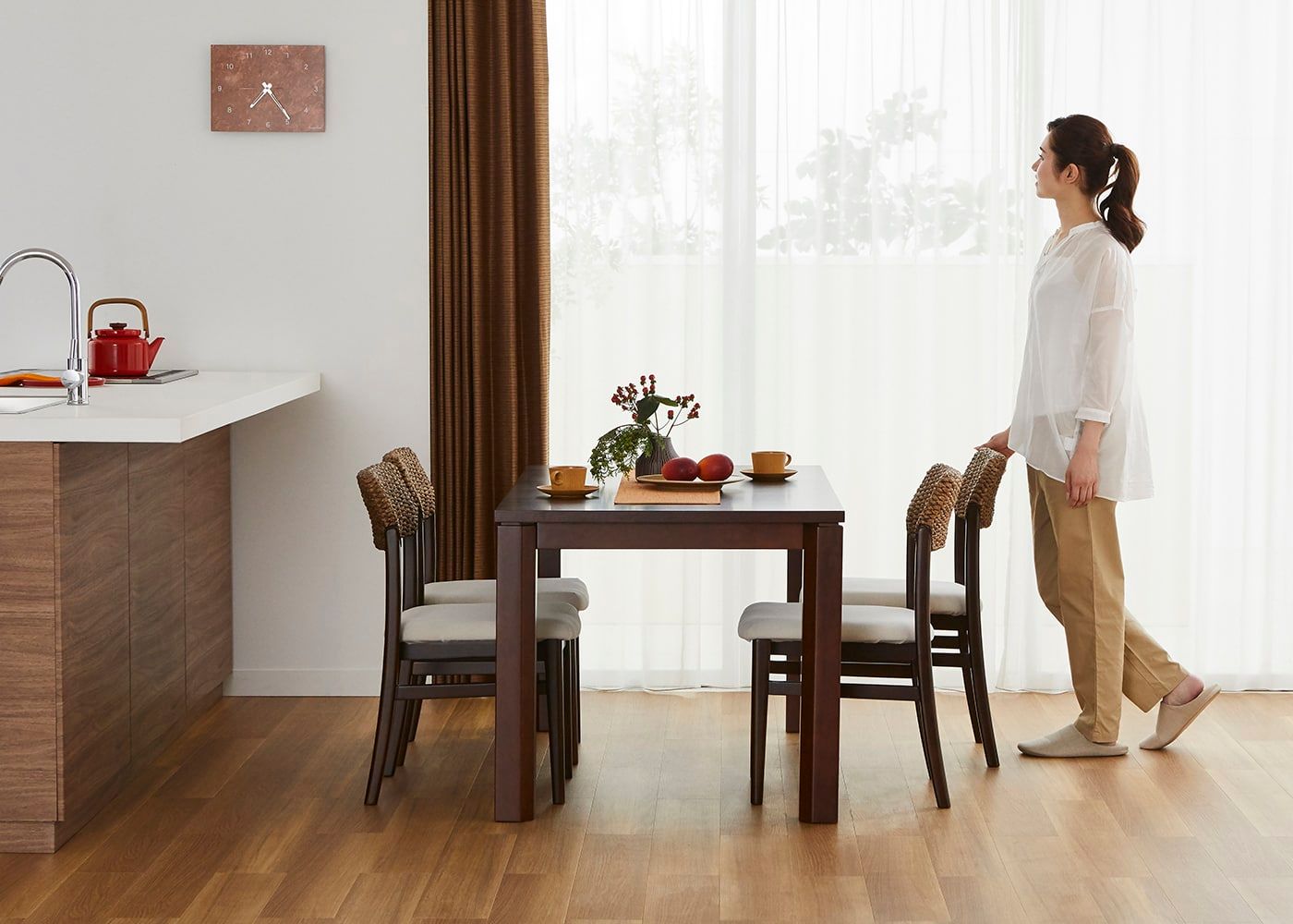 毎日過ごすリビングダイニングにエクステンション・ダイニングテーブルを置いて、家族の大切な時間をゆったりと過ごしてみましょう。(モデルは身長167cmの女性、身長172cmの男性)