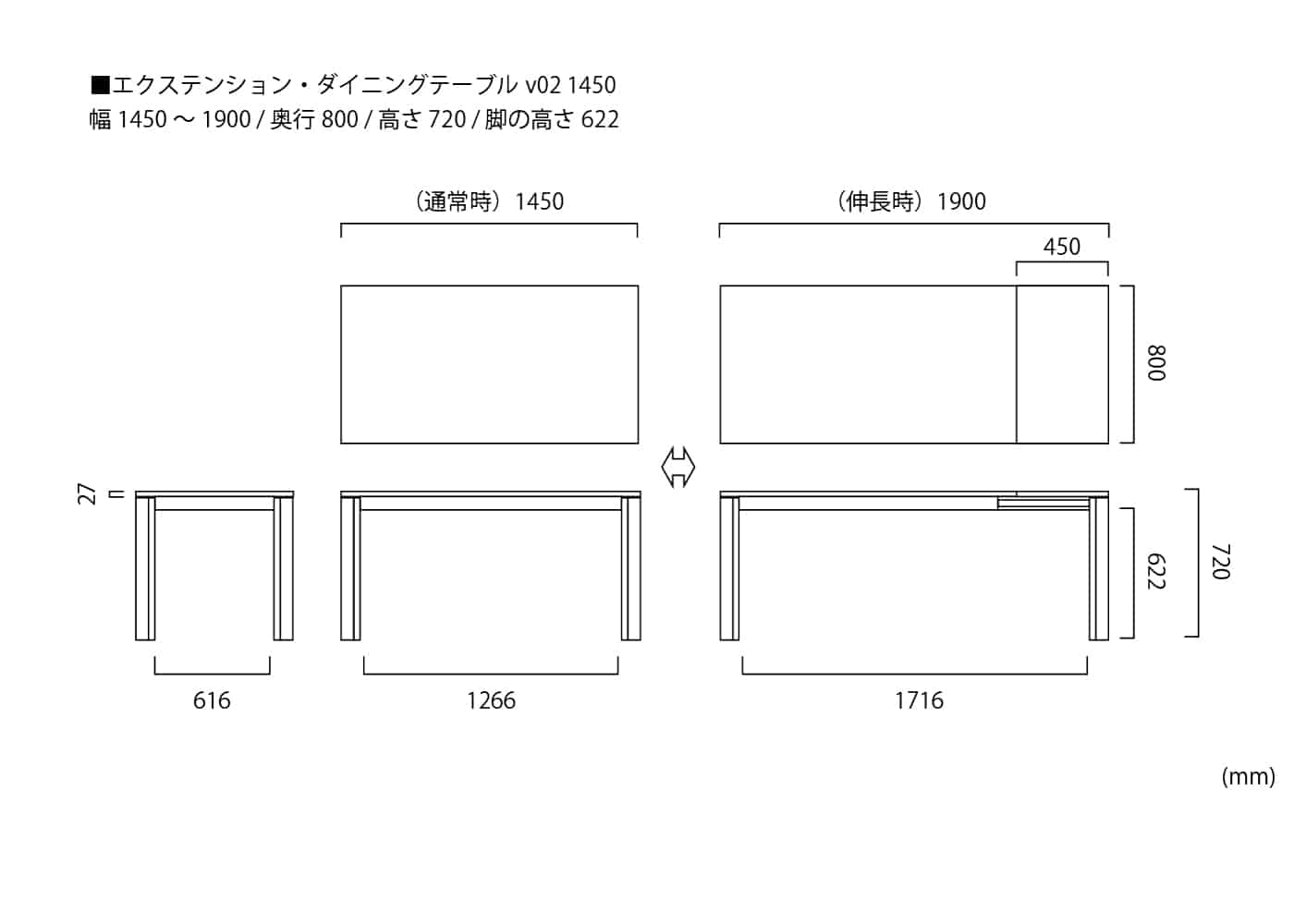 幅1450(通常時)~1900(伸長時) / 奥行800 / 高さ720 / 脚の高さ622 ※単位は mm