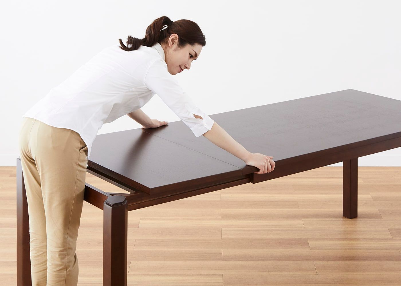 伸長天板の側面にある突起部を天板の下に差し込み、伸長天板を天板の横に置きます。そして天板の両端を両手で抑えながら太ももを使って幕板を押し戻せば、幅1900mmの6人掛けダイニングテーブルになります。