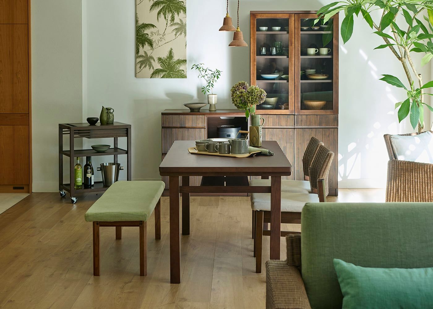 グリーンインテリアで自然を感じさせるダイニング空間の実例。椅子と背もたれのないベンチを組み合わせ、キッチン収納を山の形にレイアウト。壁にはヤシのアートパネルでアクセントを加えて、自然の中で過ごしているかのような食卓に。