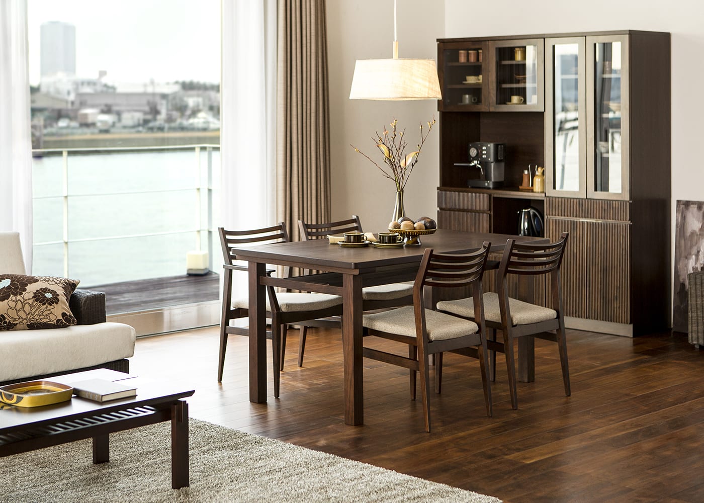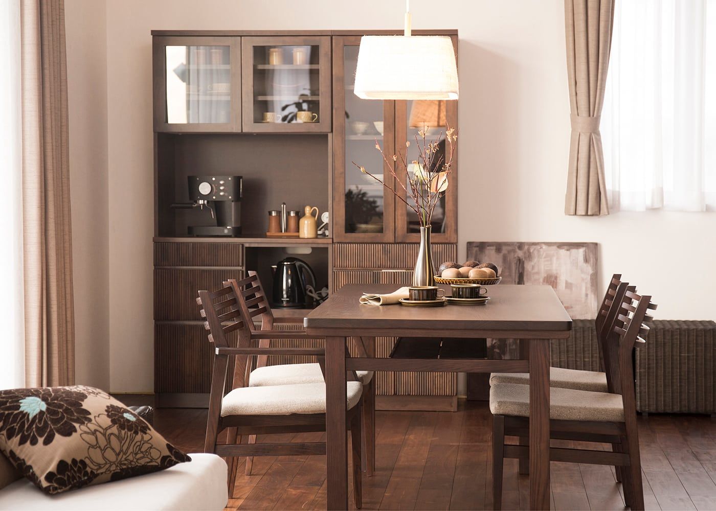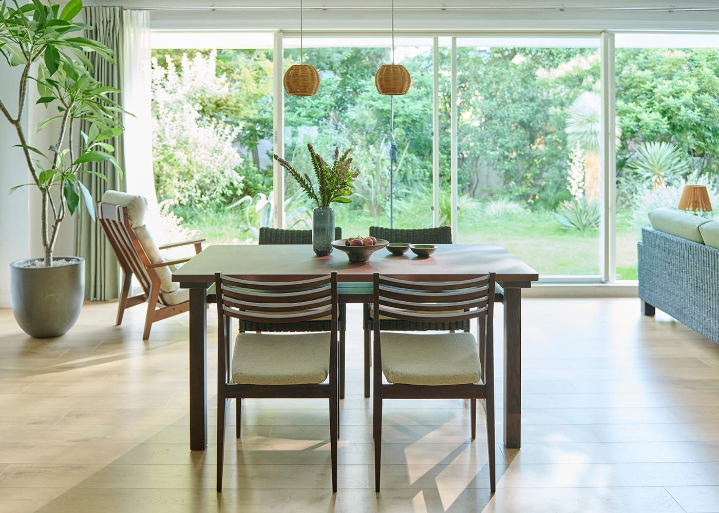 木々を想わせるハイタイプのチェアと、ムク・ダイニングテーブルが馴染み、心地よい食事の時間を味わえます。また、ペンダントライトやウッドブラインドを取り入れて、素材感やルーバーの陰影を楽しめる食卓を演出しました。