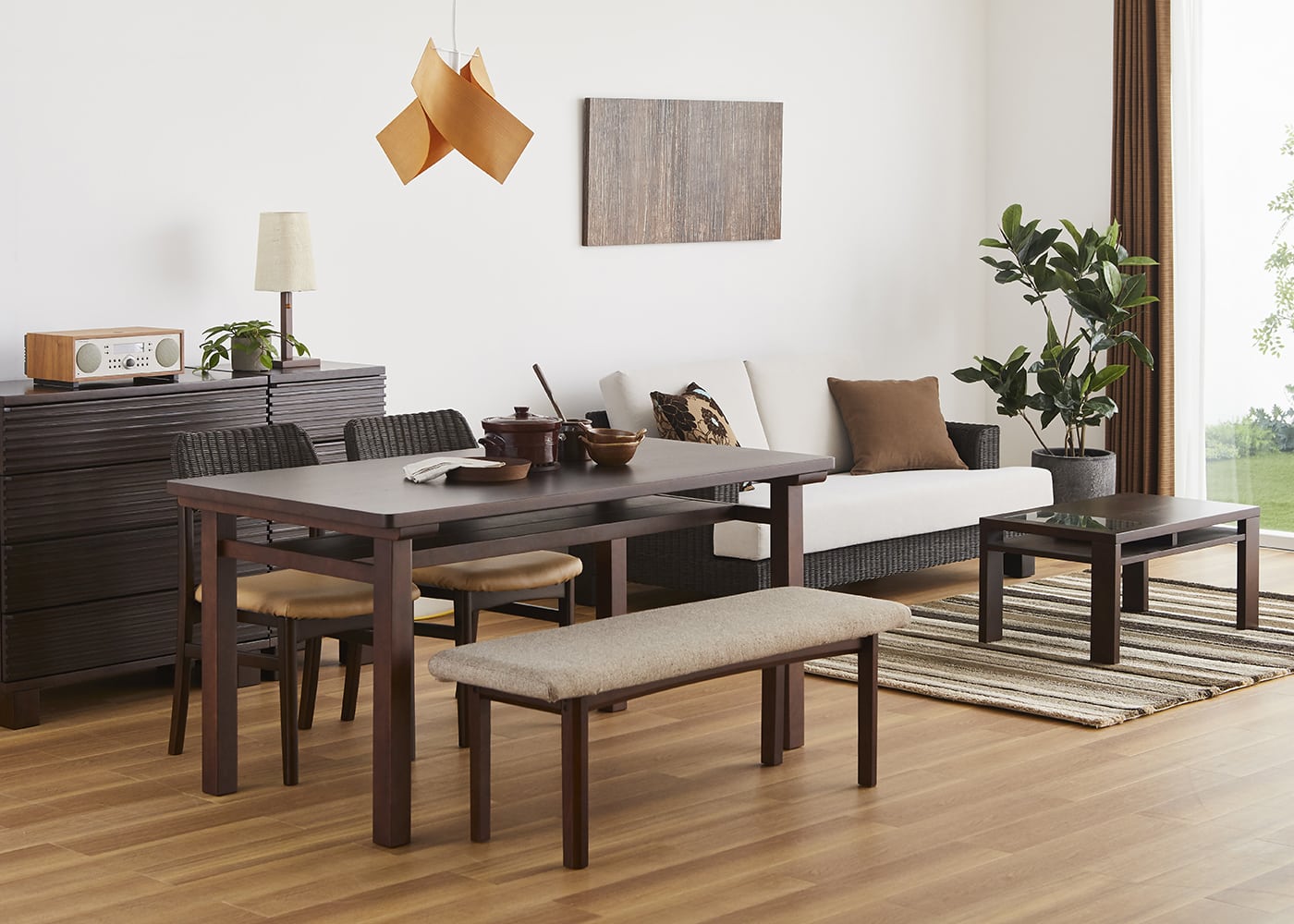 木を組み上げたようなデザインが特徴のムク・ダイニングテーブル。ダークブラウンの色合いや素材感に合わせて、部屋のイメージにマッチするお好みの