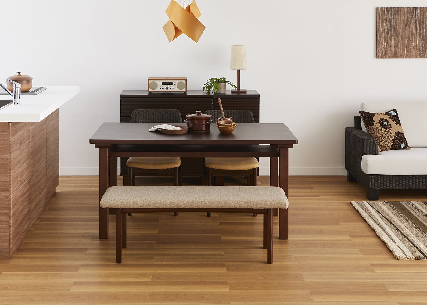 ベンチカバーでアクセントを加えたコーディネート例です。ソファの