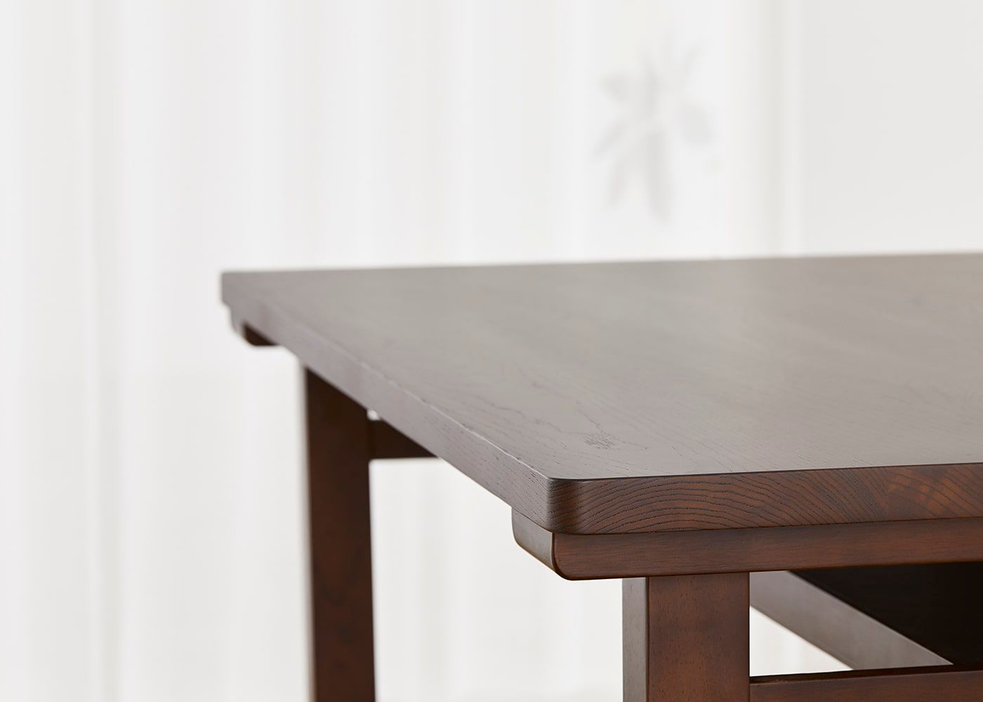 角材を組み上げたような落ち着いた雰囲気が特長のムク・ダイニングテーブル。直線と曲線のバランスをとったフォルムで、どんな椅子とも相性の良い無垢材テーブルに仕上げました。
