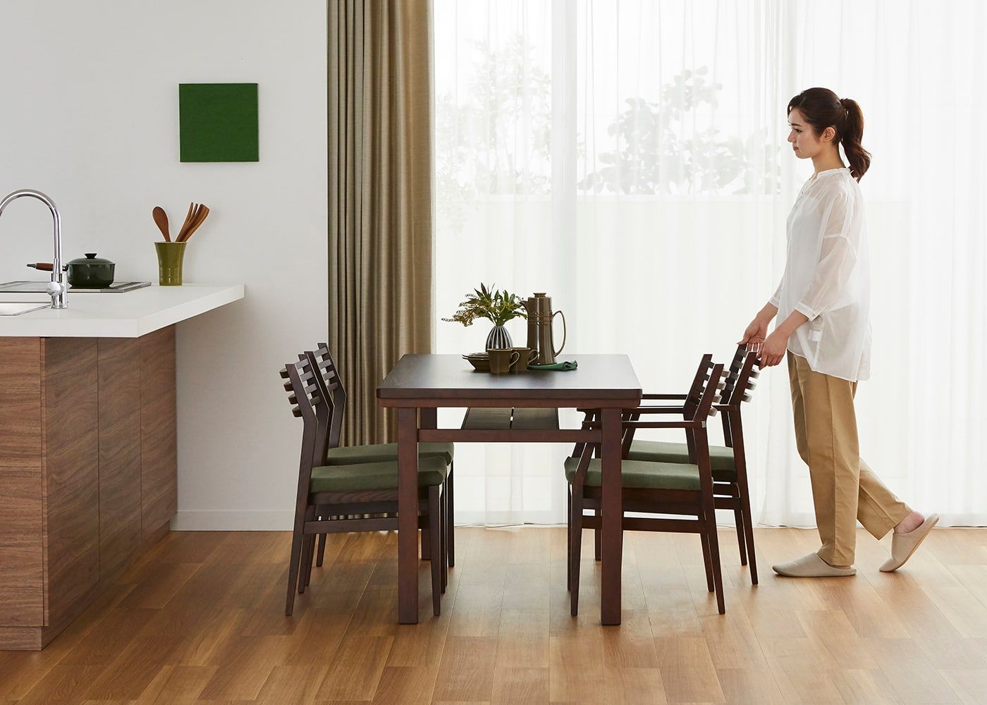無垢材テーブルの癒しが増すグリーンコーデ