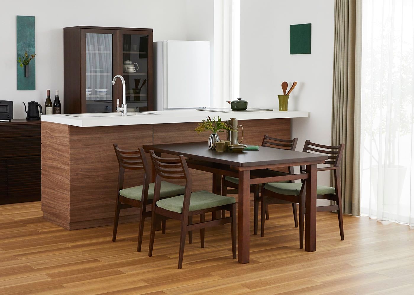 フォレストグリーン・スタイルで装飾すれば木々と緑の癒しを感じる食卓として、日々過ごすことができます。同素材の