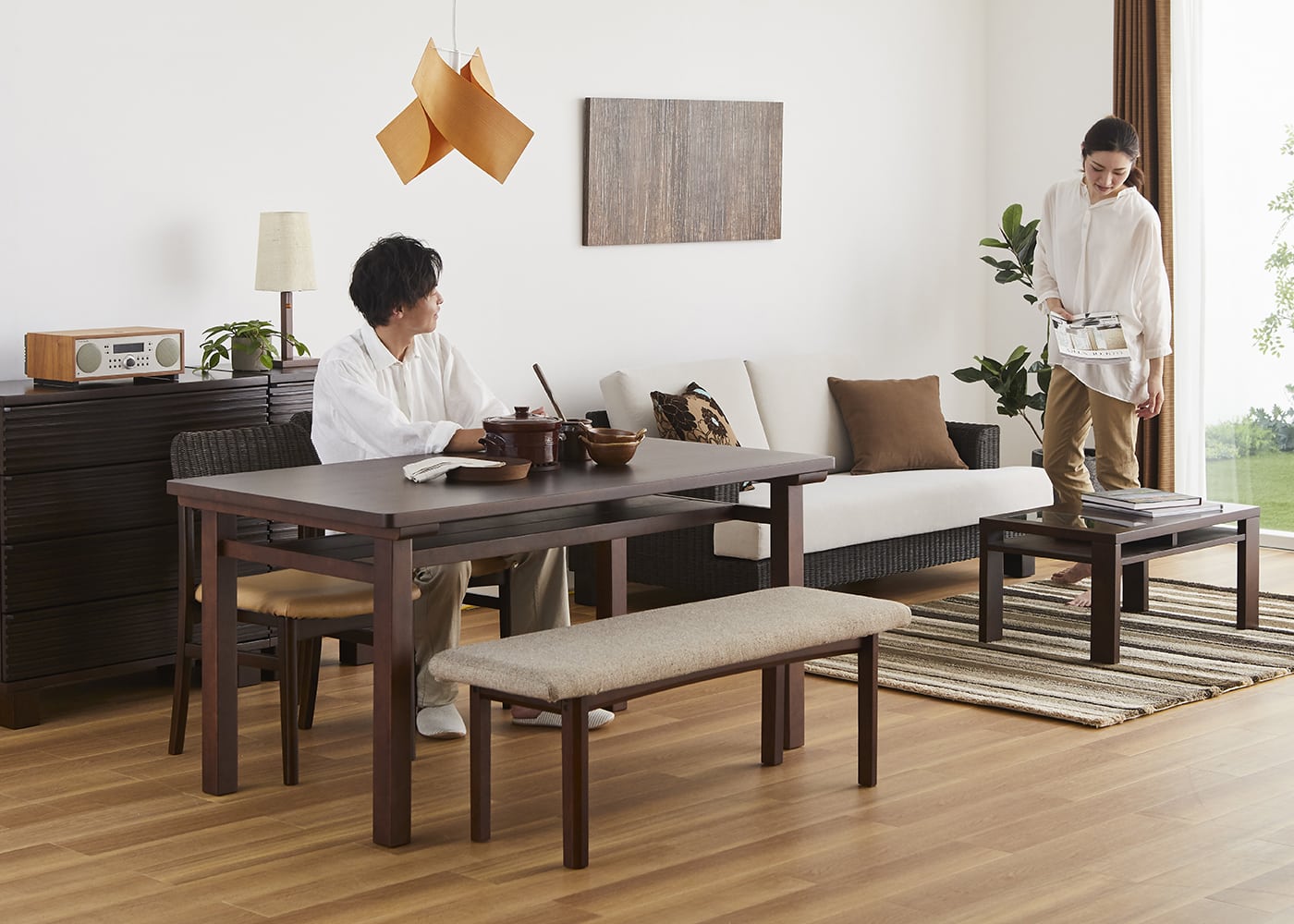 毎日過ごすリビングダイニングにムク・ダイニングテーブルを置いて、二人の大切な時間をゆったりと過ごしてみましょう。(モデルは身長172cmの男性、身長167cmの女性)