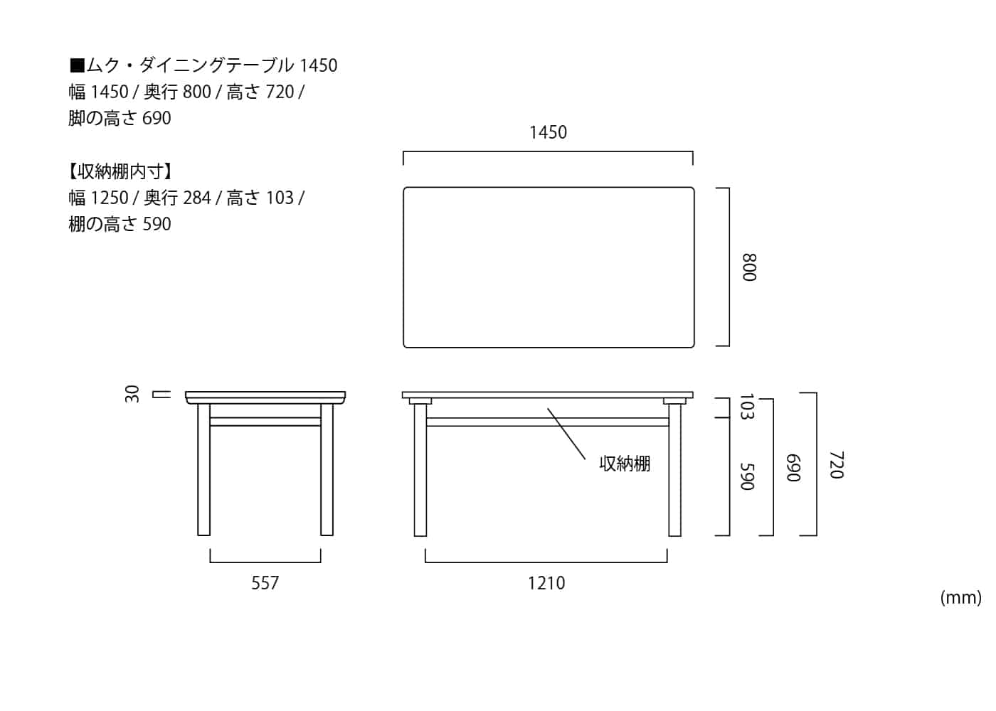 幅1450 / 奥行800 / 高さ720 / 脚の高さ690 ※単位は mm
