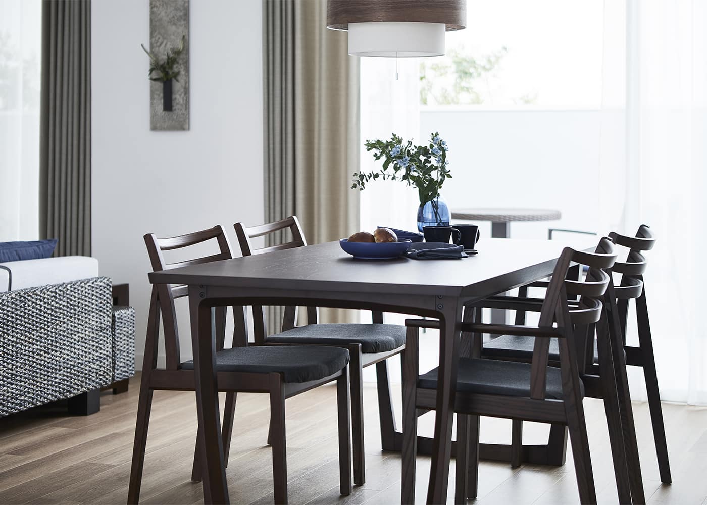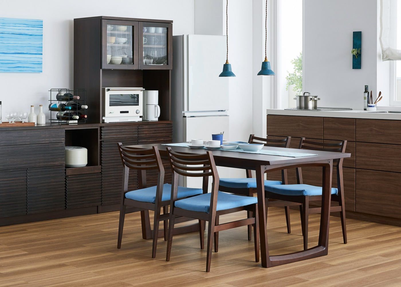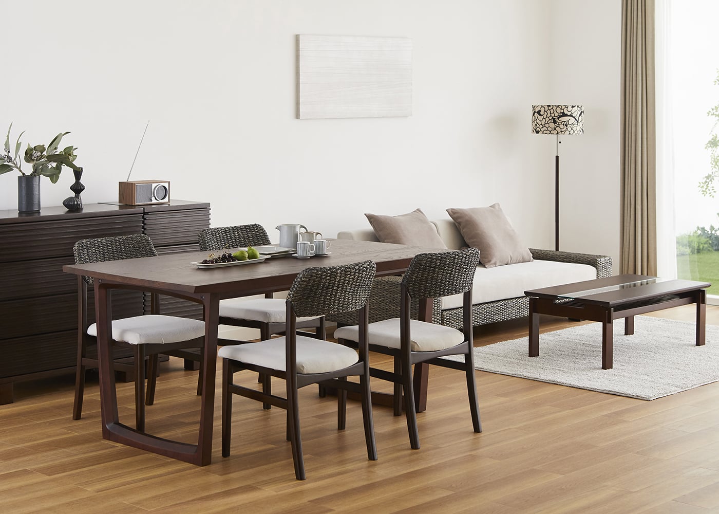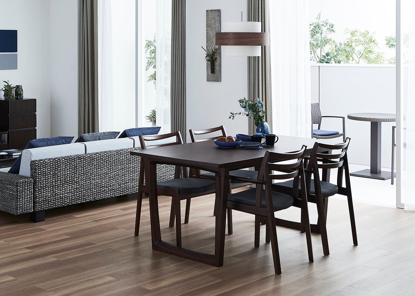セイル・チェアと組むことで、統一感のあるダークブラウンのコーディネートを楽しめます。お好みのチェアカバーなどもプラスして、理想の食卓を叶えてください。(写真のチェアカバーは