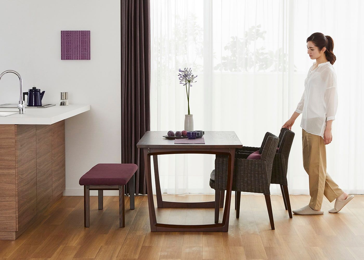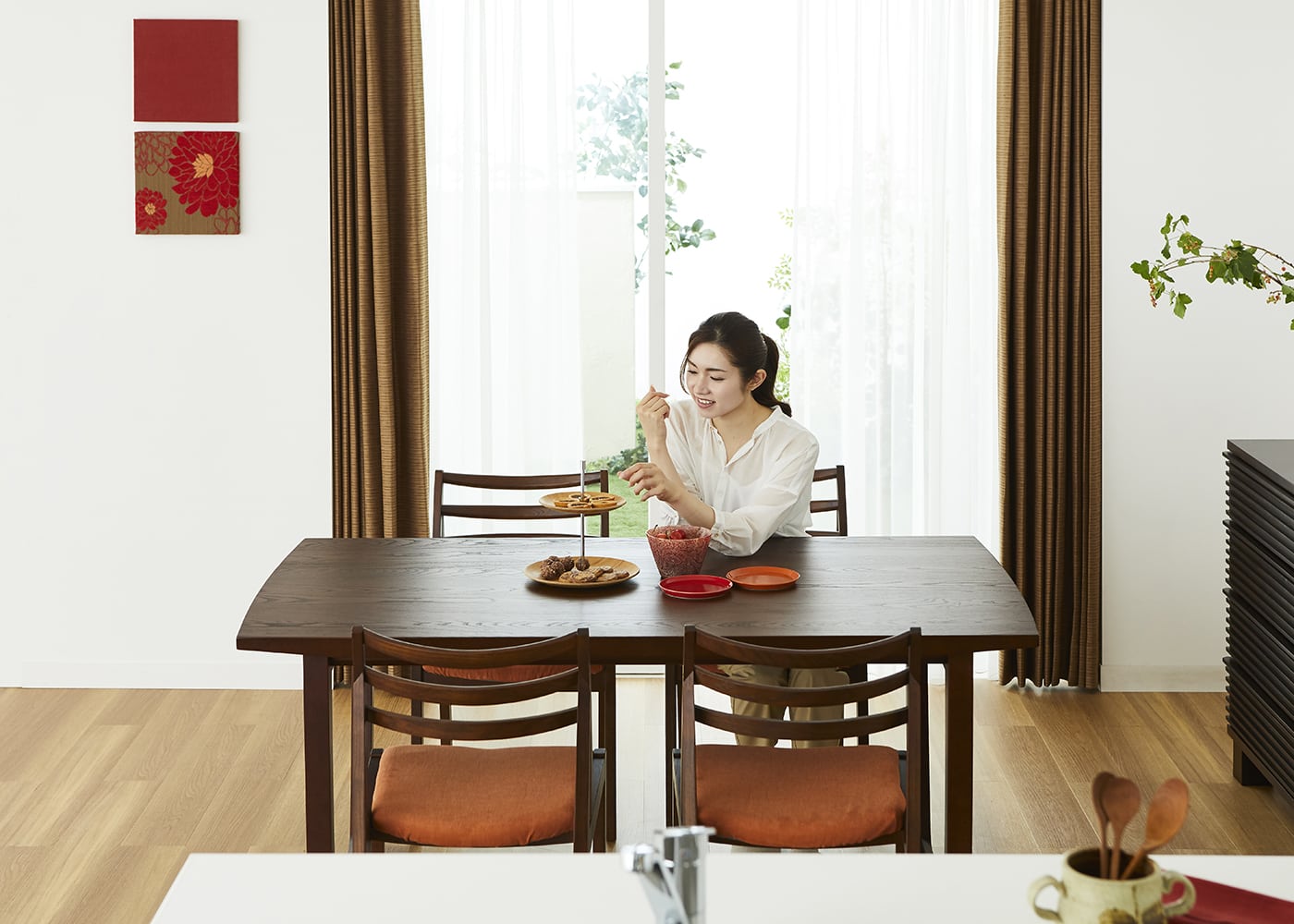 毎日過ごすリビングダイニングにセイル・ダイニングテーブルを置いて、大切な時間をゆったりと過ごしてみましょう。(モデルは身長167cmの女性)
