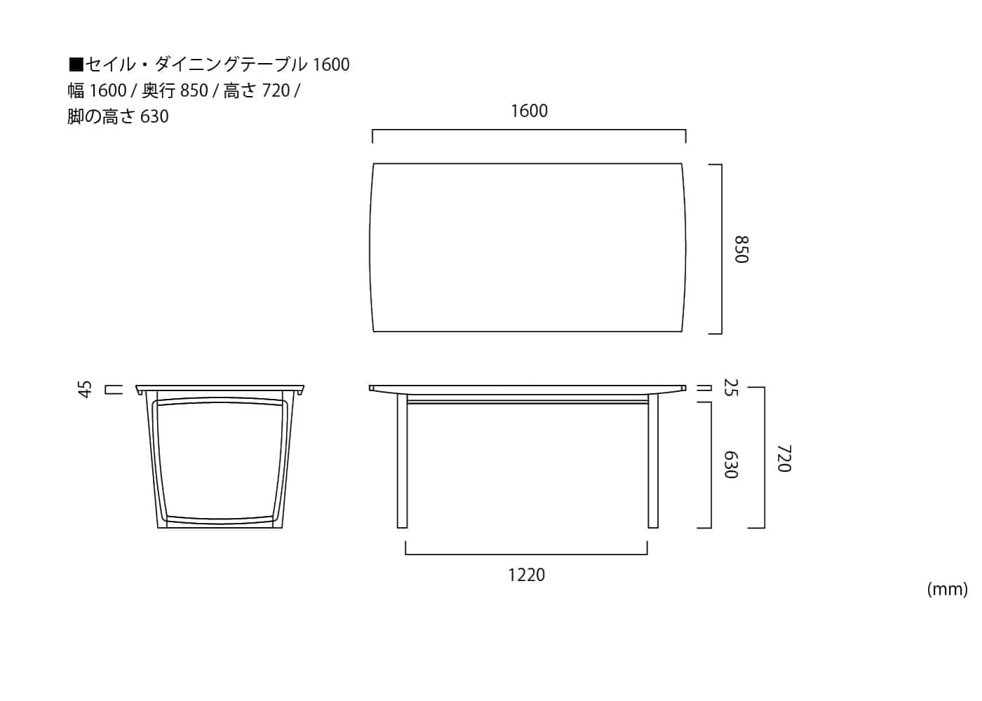 幅1600 / 奥行850 / 高さ720 / 脚の高さ630 ※単位は mm