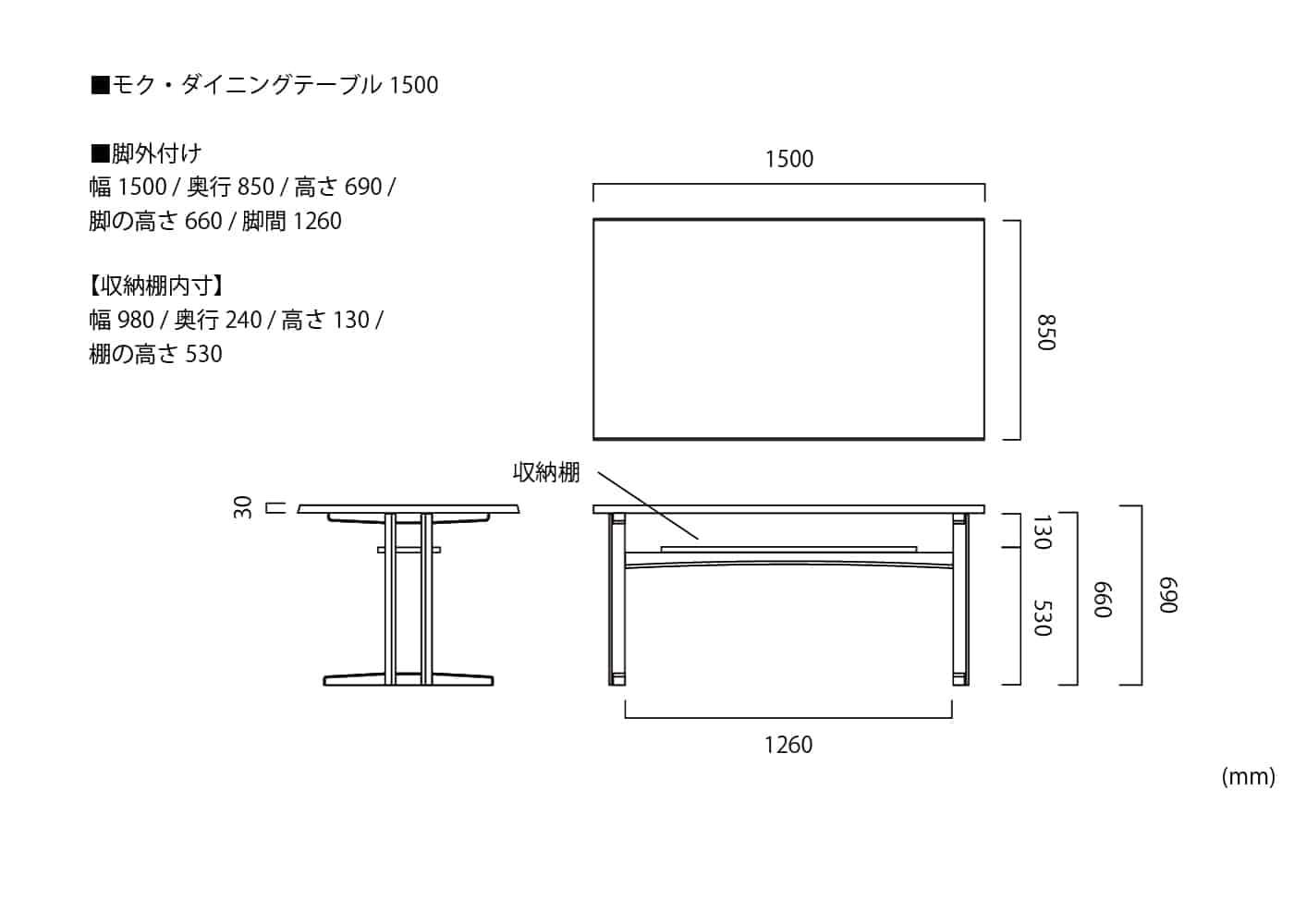 幅1500 / 奥行850 / 高さ690 / 脚の高さ660 / 脚間 1260