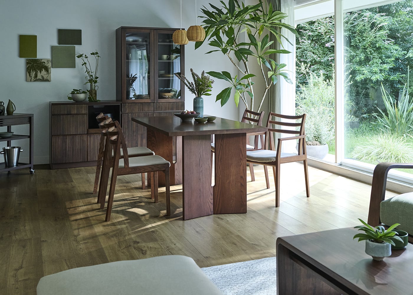 自然の癒しを気軽に取り入れやすい、グリーンインテリアのカラーコーディネート実例。木の風合いが魅力のグラン・ダイニングテーブルと相性抜群です。木々の存在感を感じさせるデザインのダイニング&チェアと合わせて、毎日の食卓を心地よいスペースに仕上げてみては。