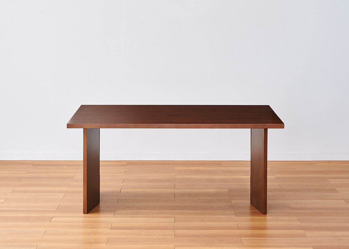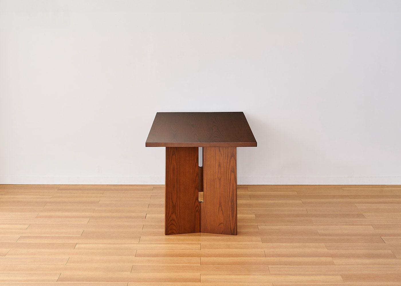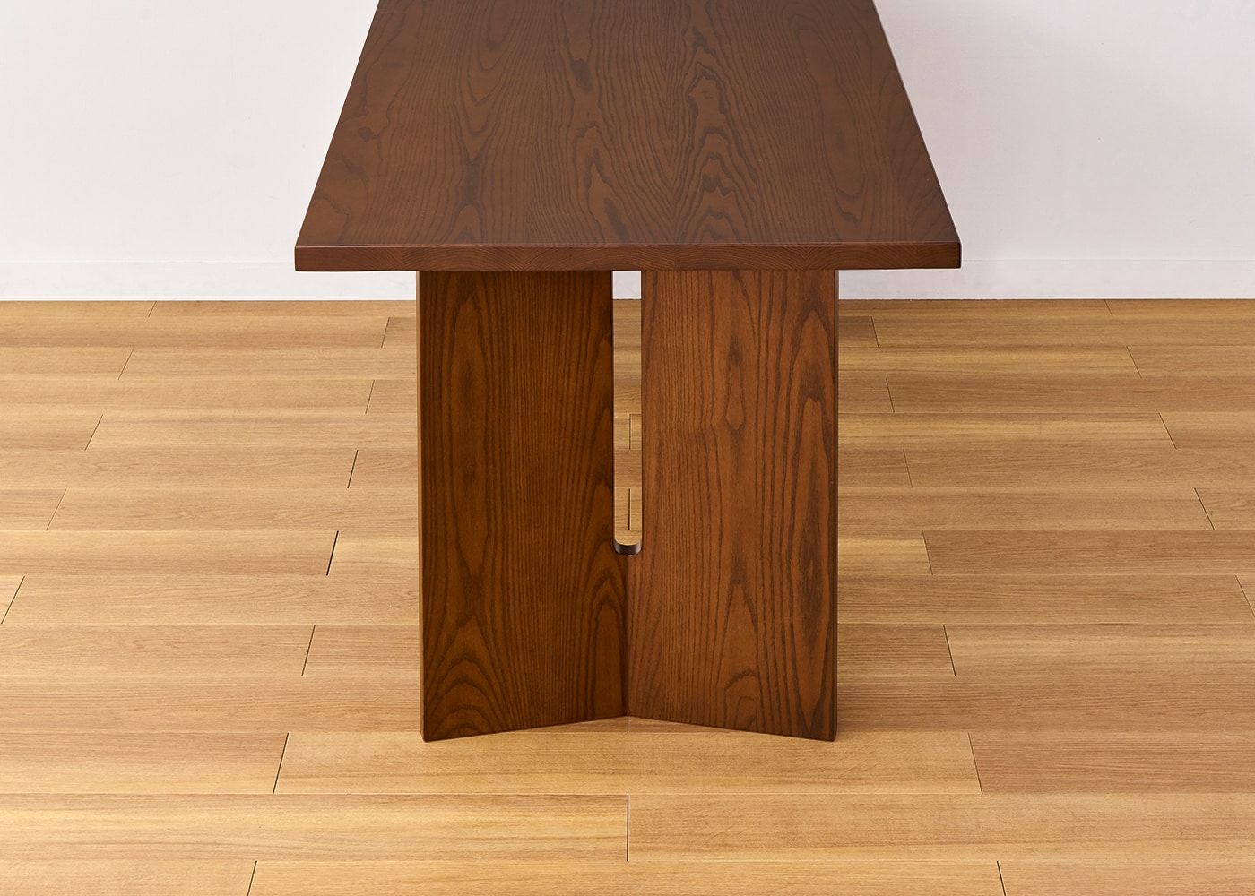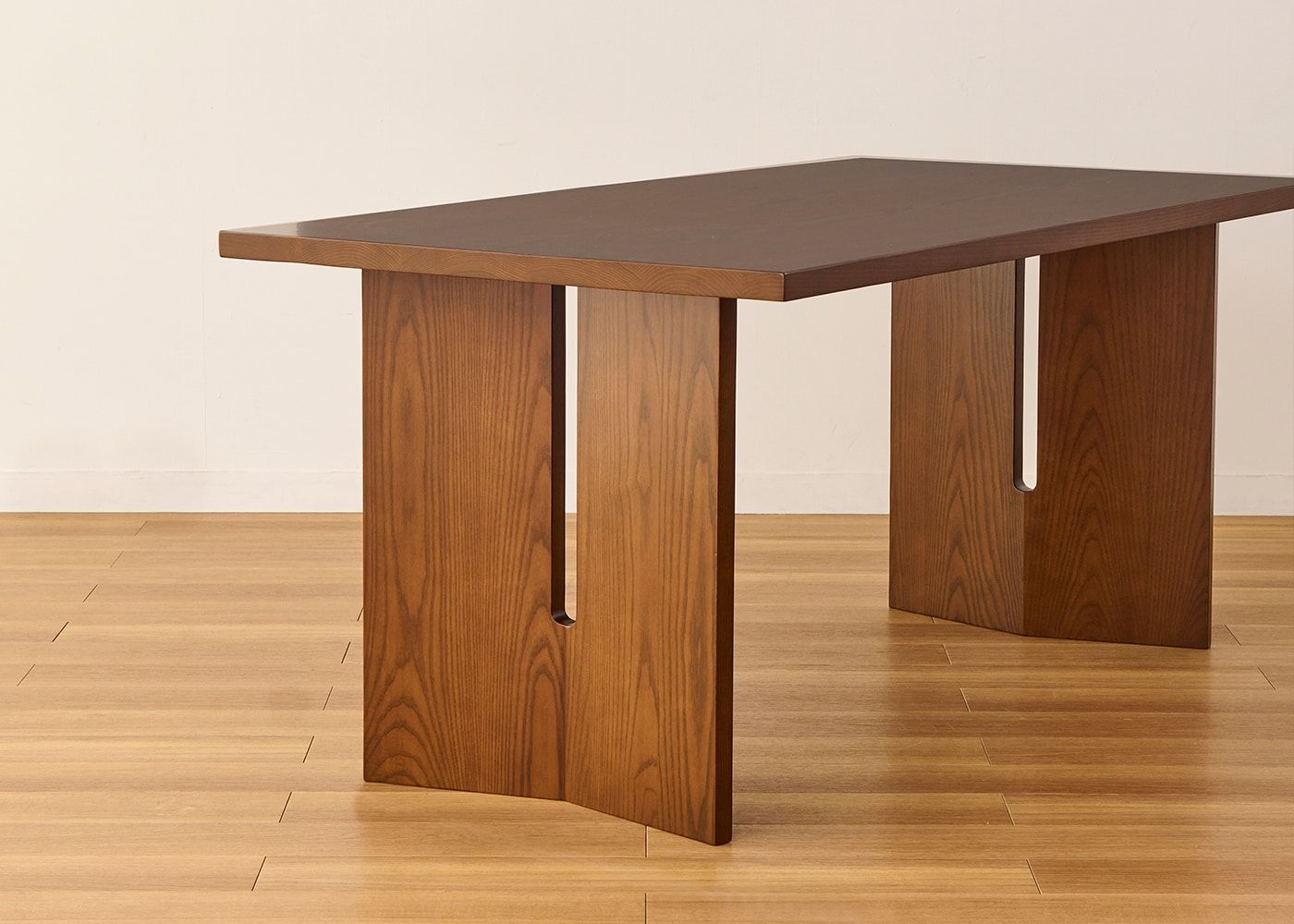 一見シンプルな板状の脚ですが、緩やかに角度をつけた「くの字」形状の脚が特長のテーブルです。他では見られないユニークなフォルムを描きつつ、足元のスペースを広くなるように設計。テーブルの両側に座る人が快適に過ごせる工夫がされています。