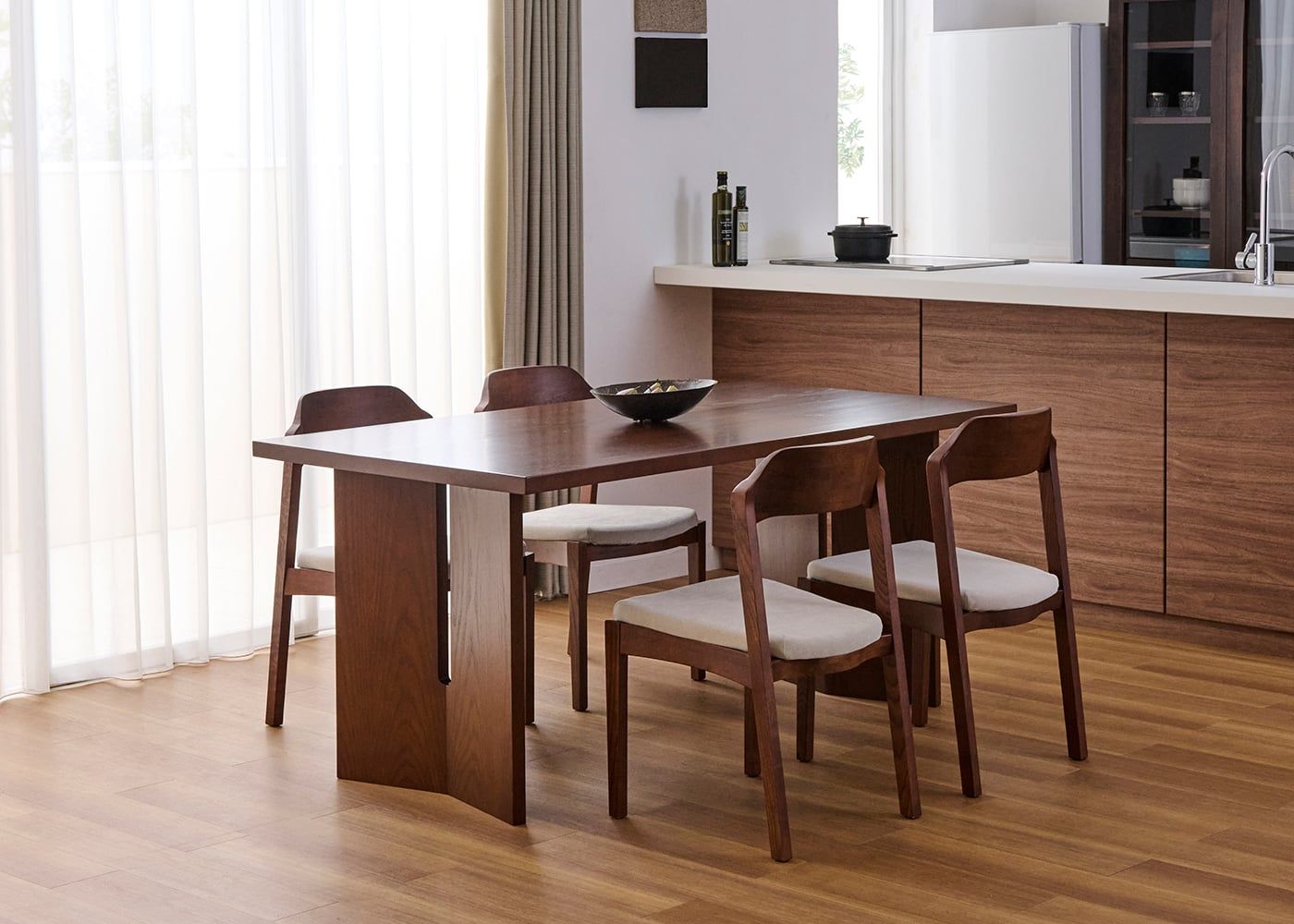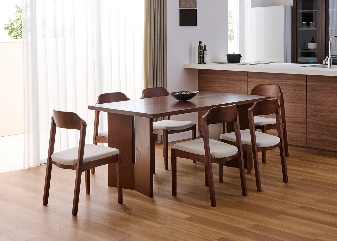 ここからは、ダイニングセット例(4~6人掛け)をご紹介します。同じアッシュ無垢材で統一した無垢材の温もりを楽しめるセット。脚外付けタイプは片側に2人ずつ、合計4人でも余裕をもって座れます。(写真は