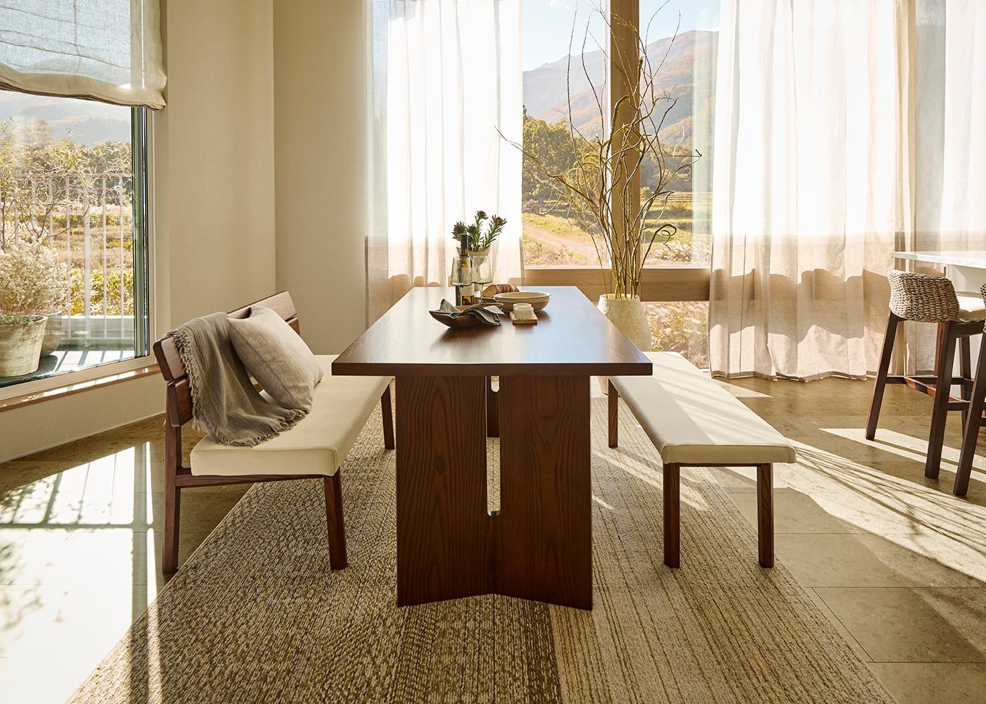 グラン・ダイニングテーブルは存在感のある天板や脚のフォルム、そして無垢材が持つダイナミックさや素材感を取り入れることで、大地の雄大さを表現しました。