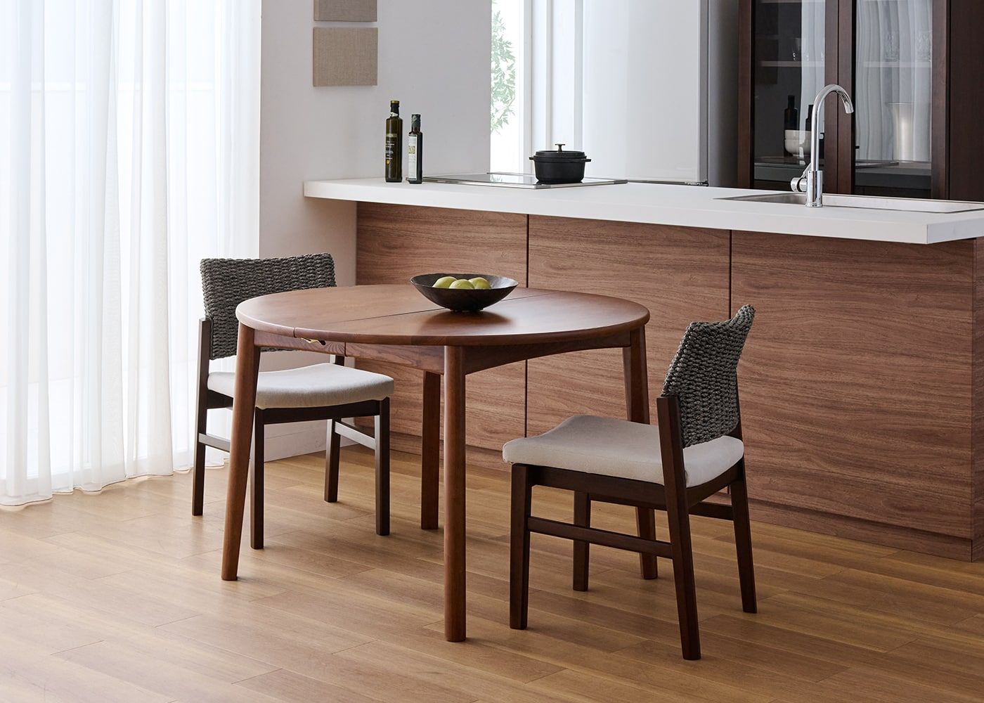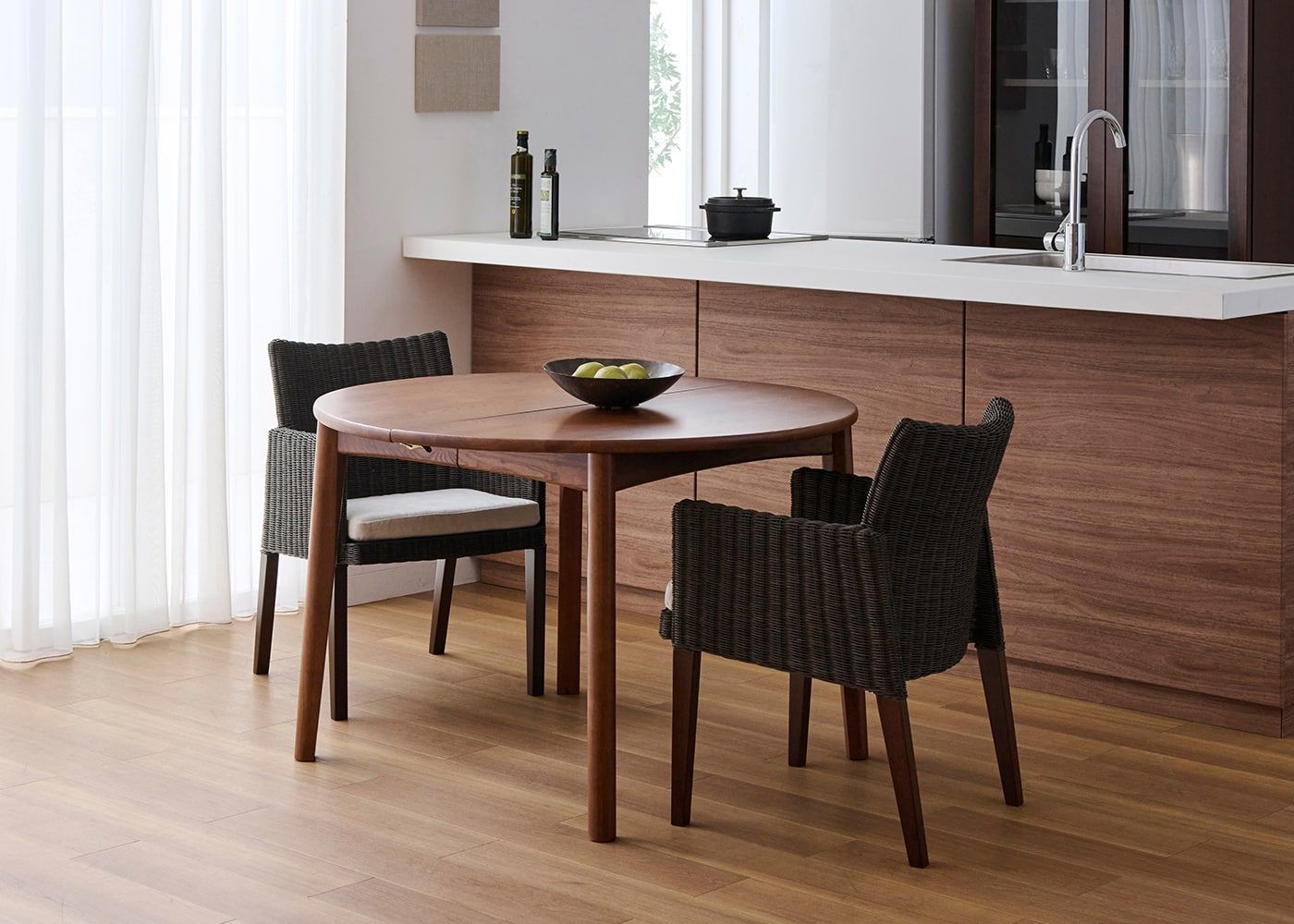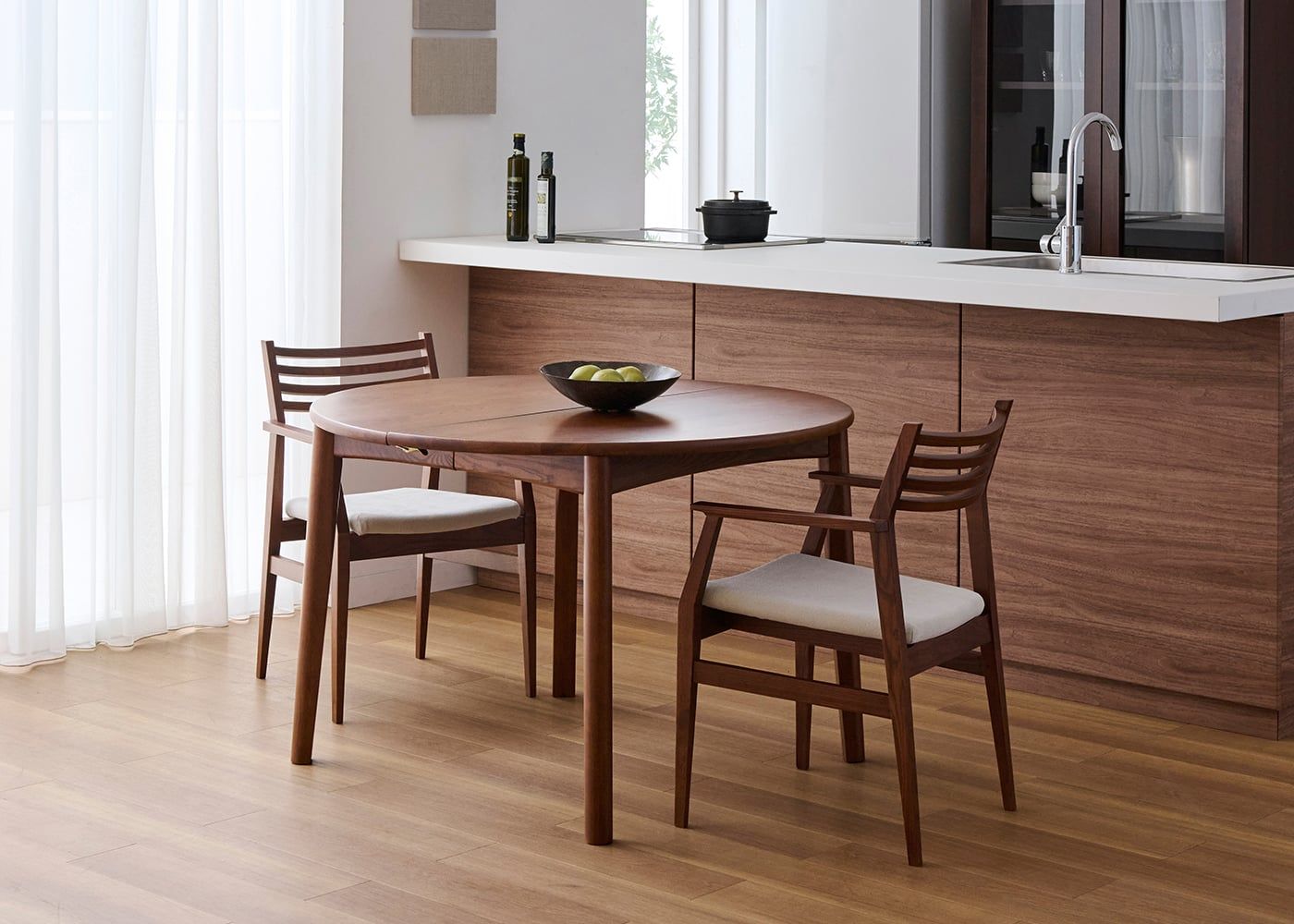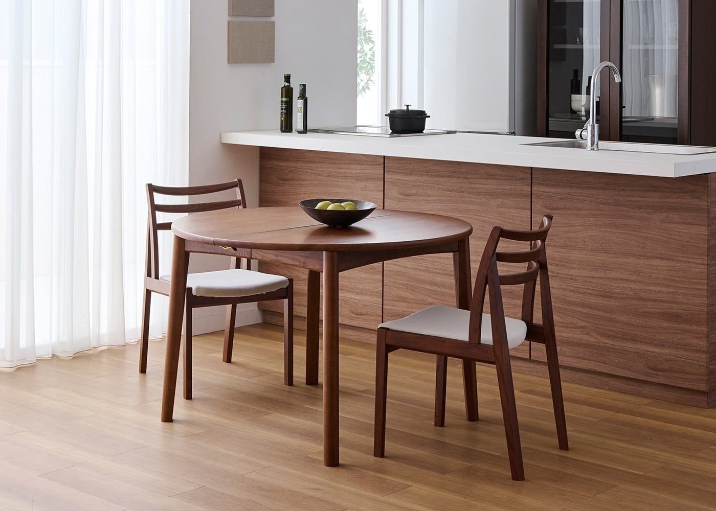 円形ダイニングテーブルは、その柔らかな形状が魅力です。空間に優しげな印象をもたらすとともに、どの席からも相手の顔が見やすく、家族や友人との会話も弾みやすいダイニングを作れます。(写真はエン・伸長式ダイニングテーブル1100(GB) v01、伸長前の幅1100mm)