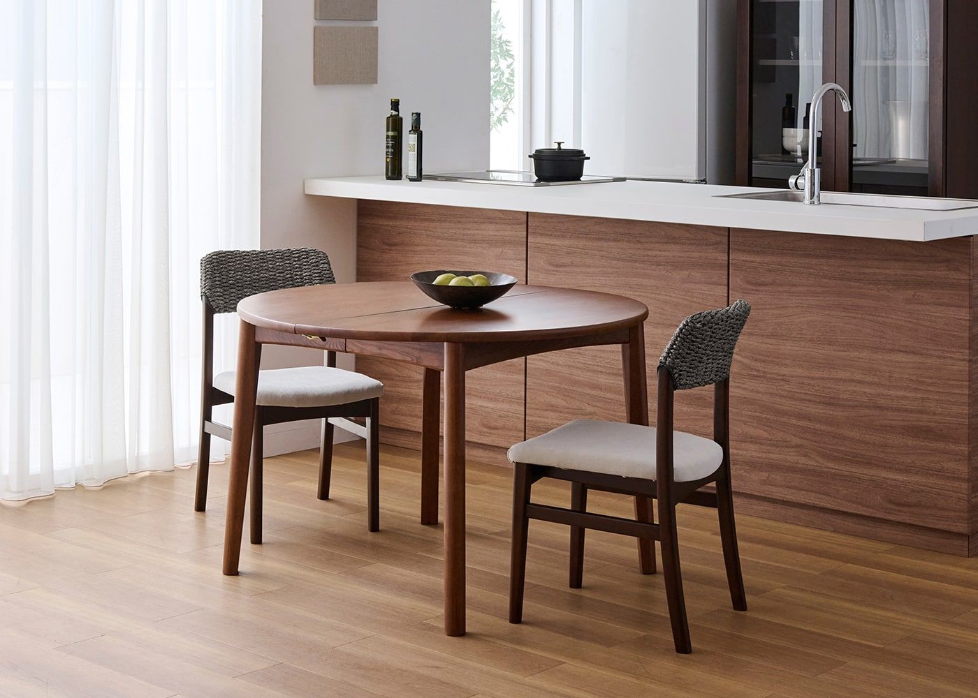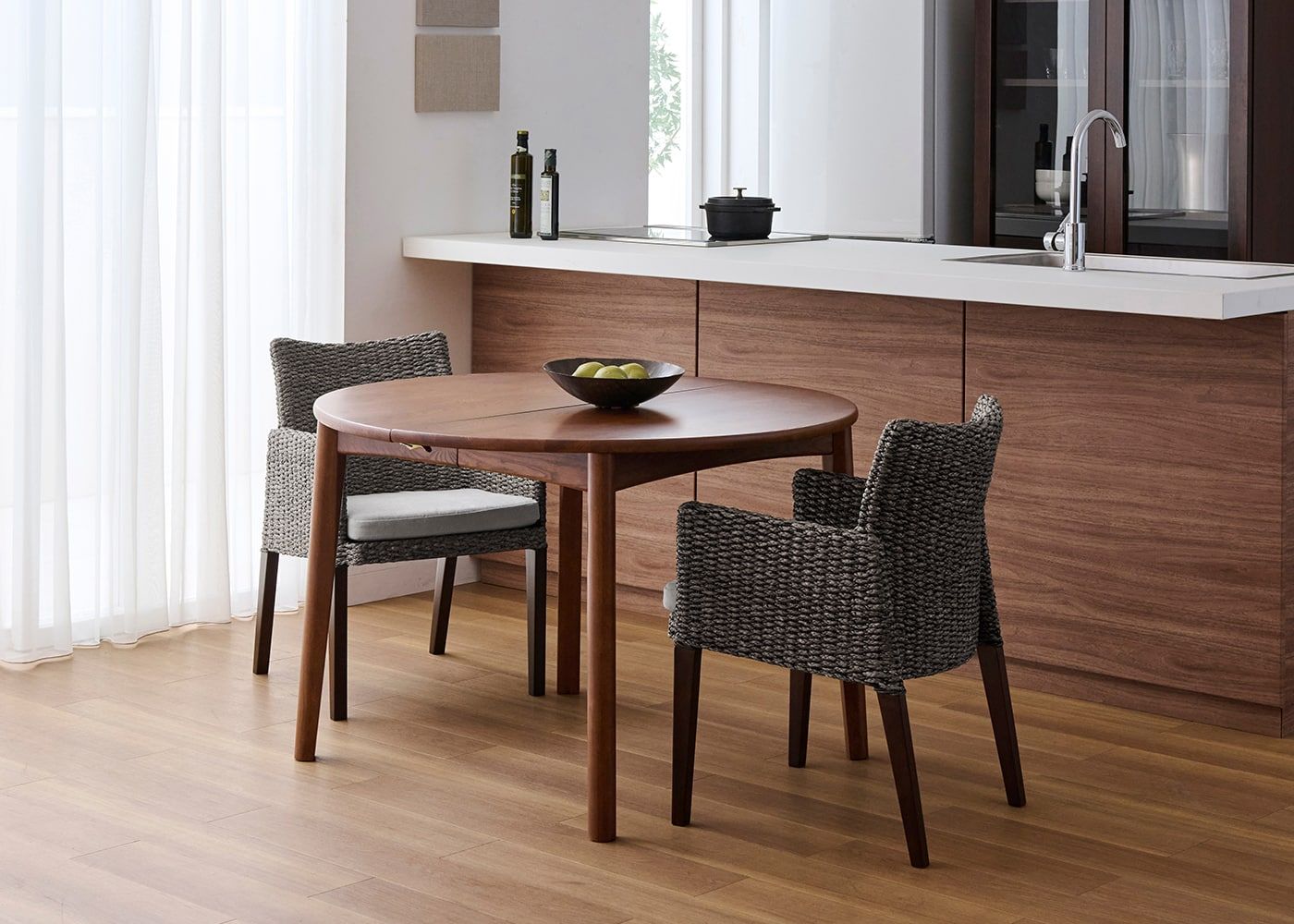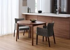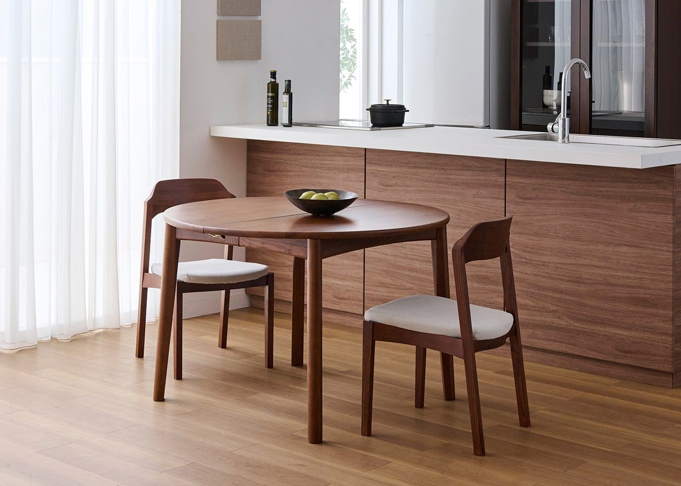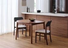 円形ダイニングテーブルは、その柔らかな形状が魅力です。空間に優しげな印象をもたらすとともに、どの席からも相手の顔が見やすく、家族や友人との会話も弾みやすいダイニングを作れます。(写真はエン・伸長式ダイニングテーブル1100(GB) v01、伸長前の幅1100mm)