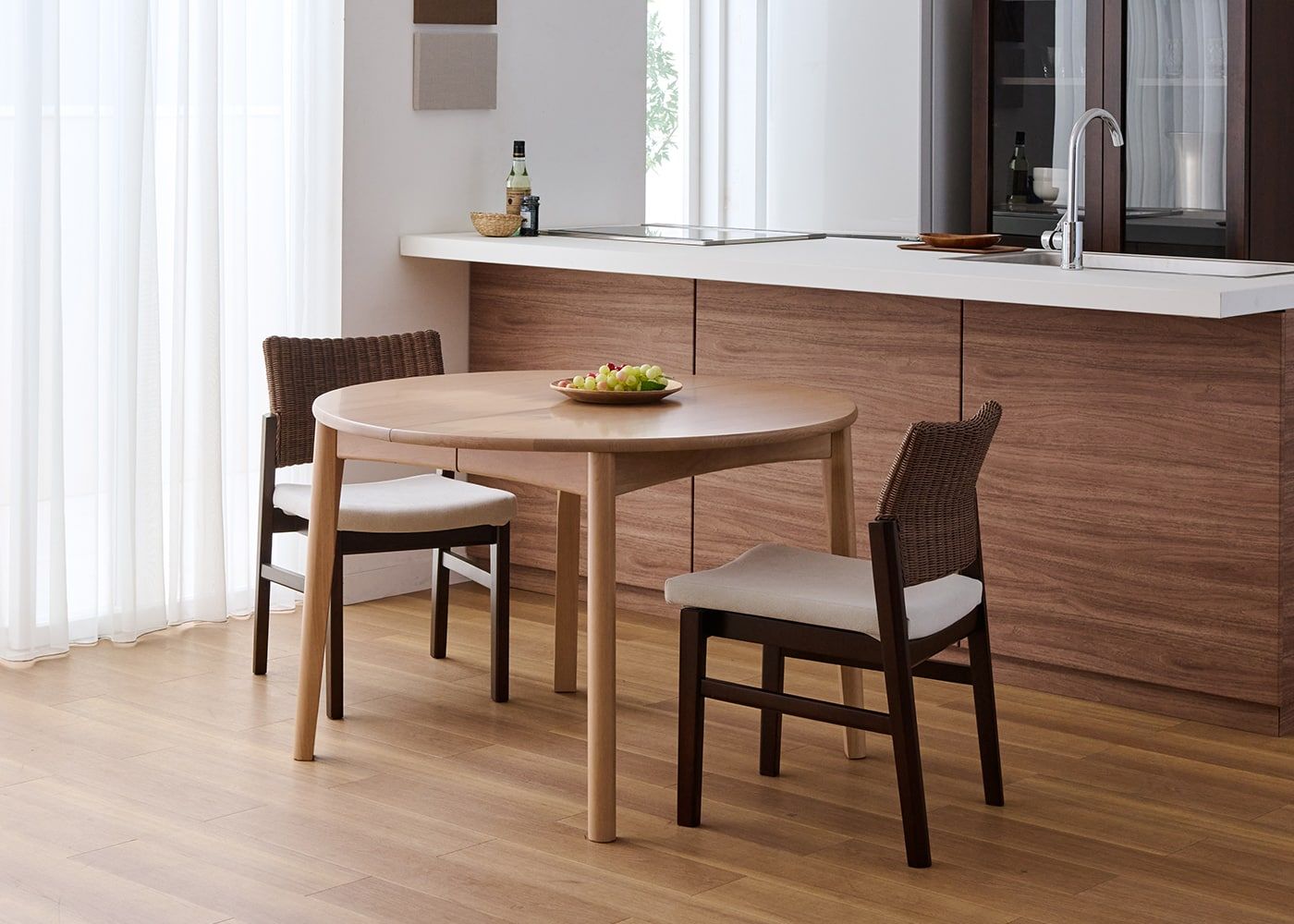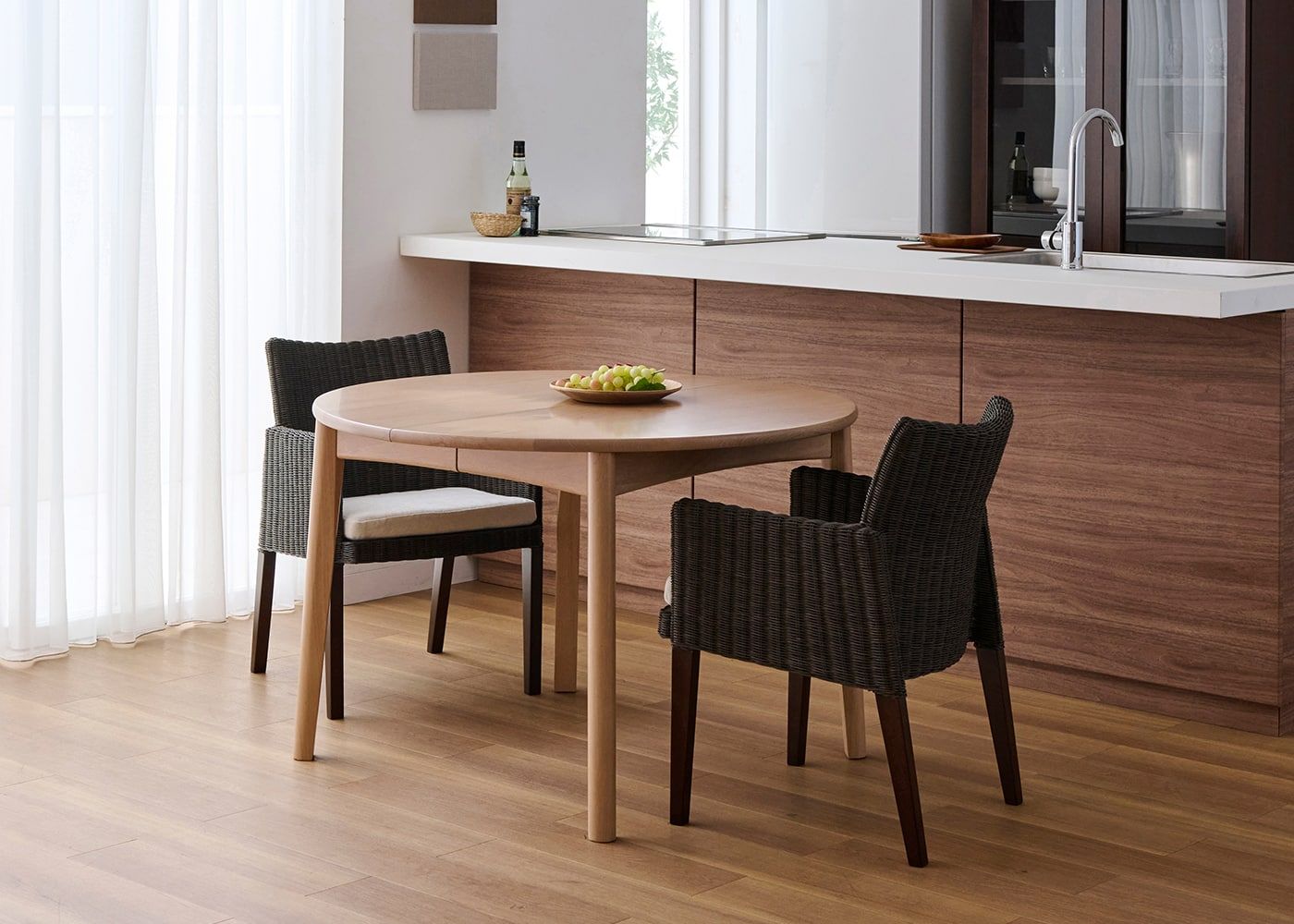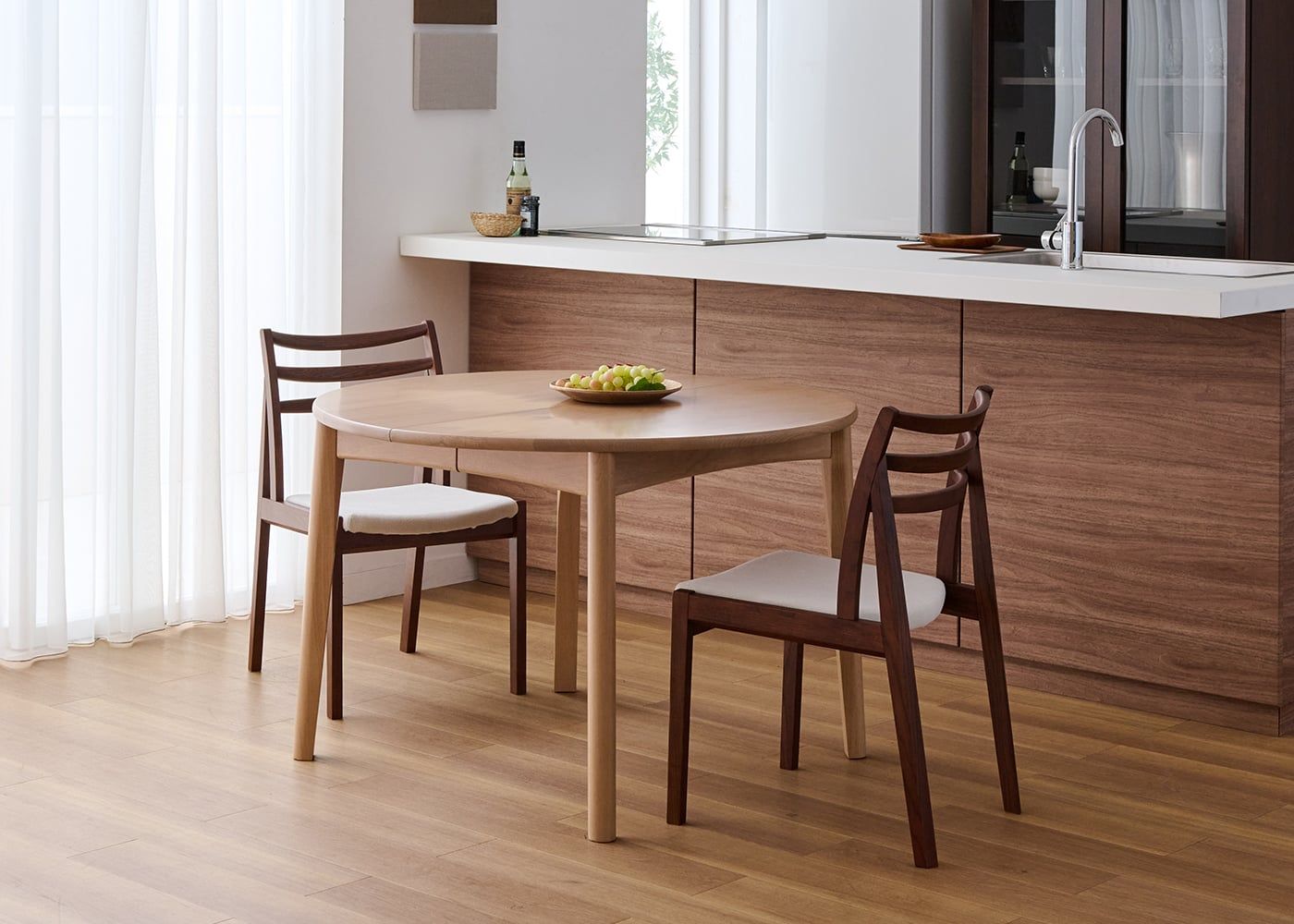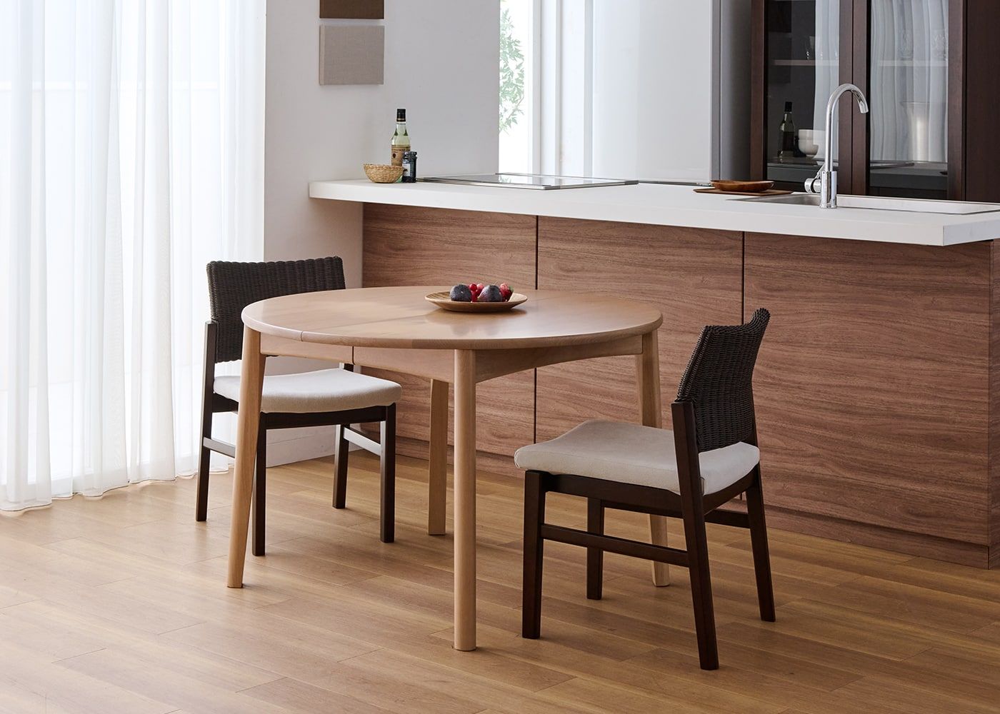 円形ダイニングテーブルは、その柔らかな形状が魅力です。空間に優しげな印象をもたらすとともに、どの席からも相手の顔が見やすく、家族や友人との会話も弾みやすいダイニングを作れます。(写真はエン・伸長式ダイニングテーブル1100(GB) v01、伸長前の幅1100mm)