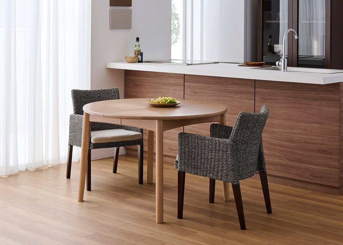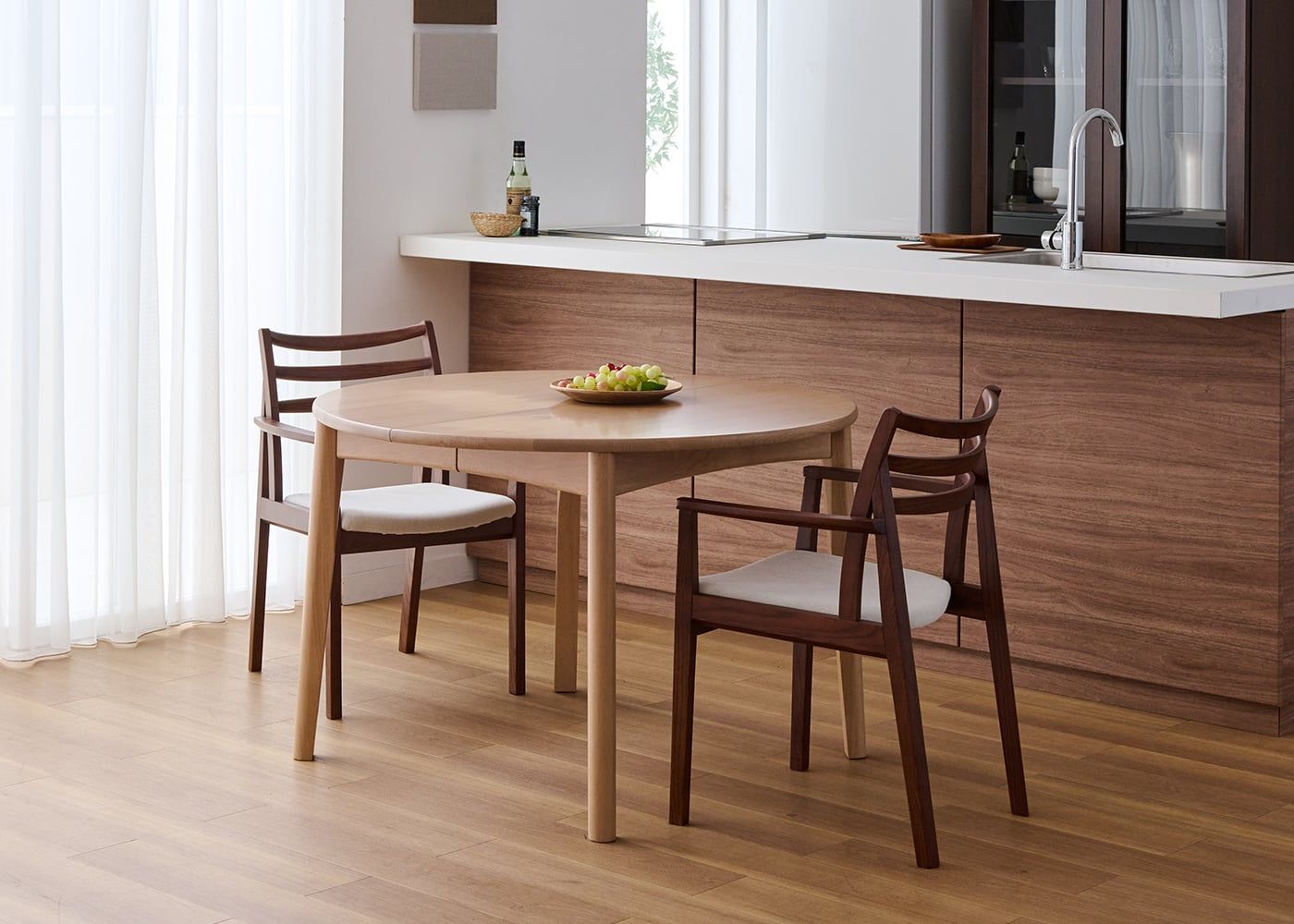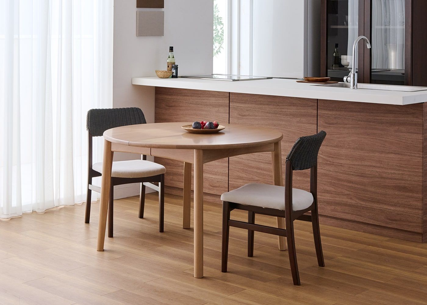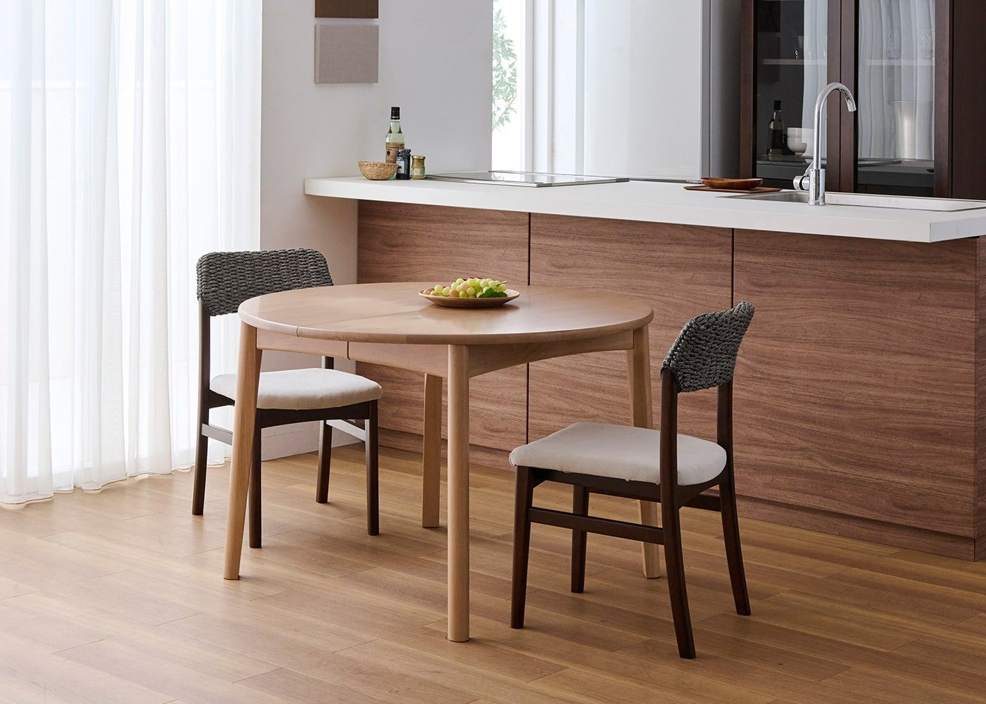 円形ダイニングテーブルは、その柔らかな形状が魅力です。空間に優しげな印象をもたらすとともに、どの席からも相手の顔が見やすく、家族や友人との会話も弾みやすいダイニングを作れます。(写真はエン・伸長式ダイニングテーブル1100(GB) v01、伸長前の幅1100mm)