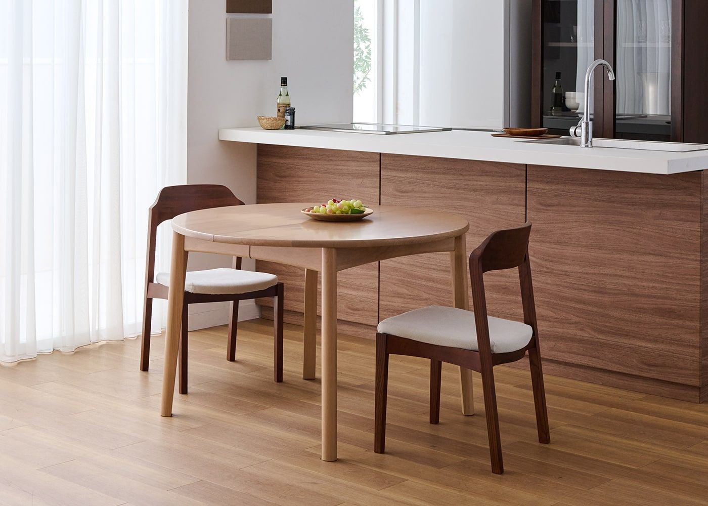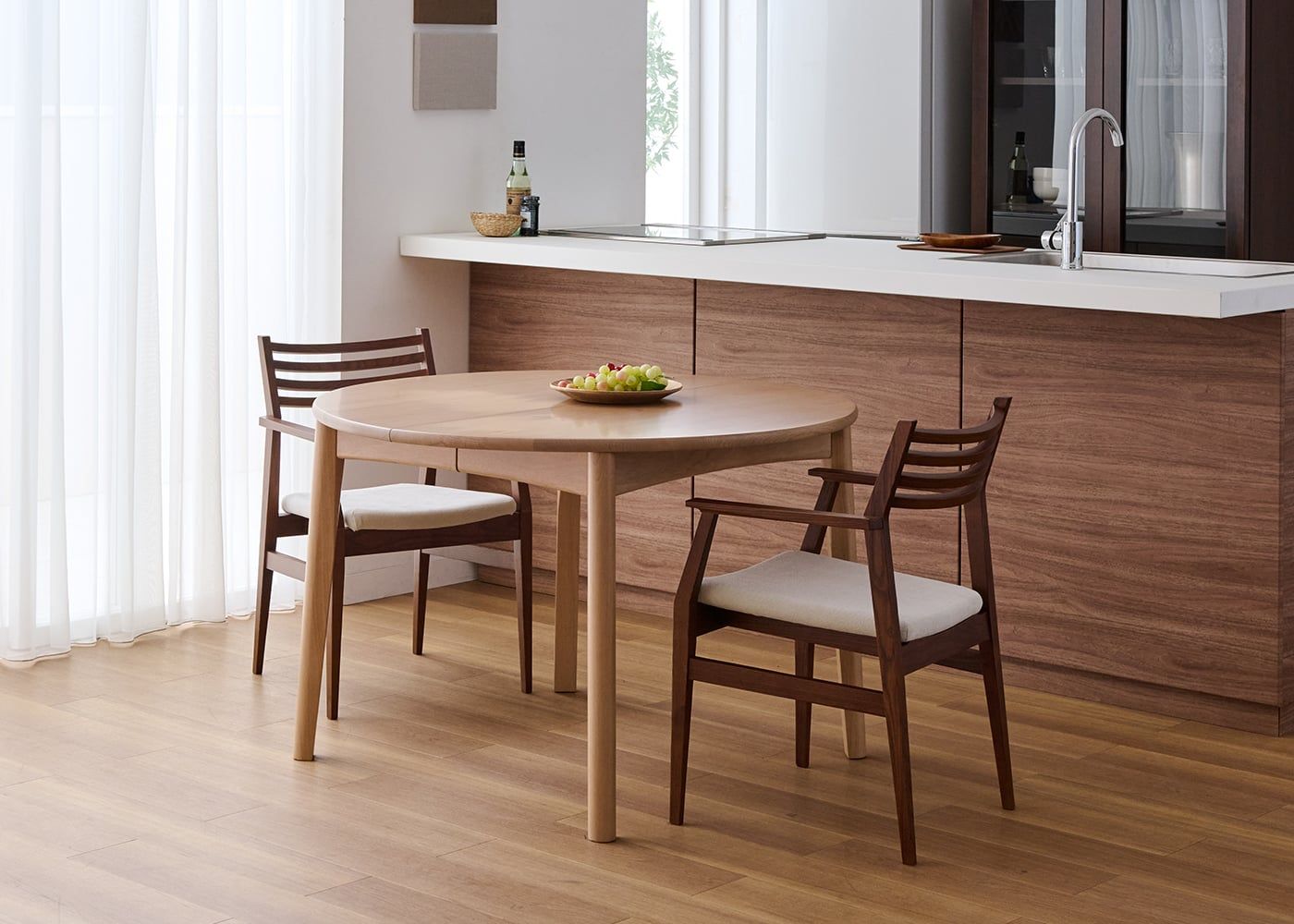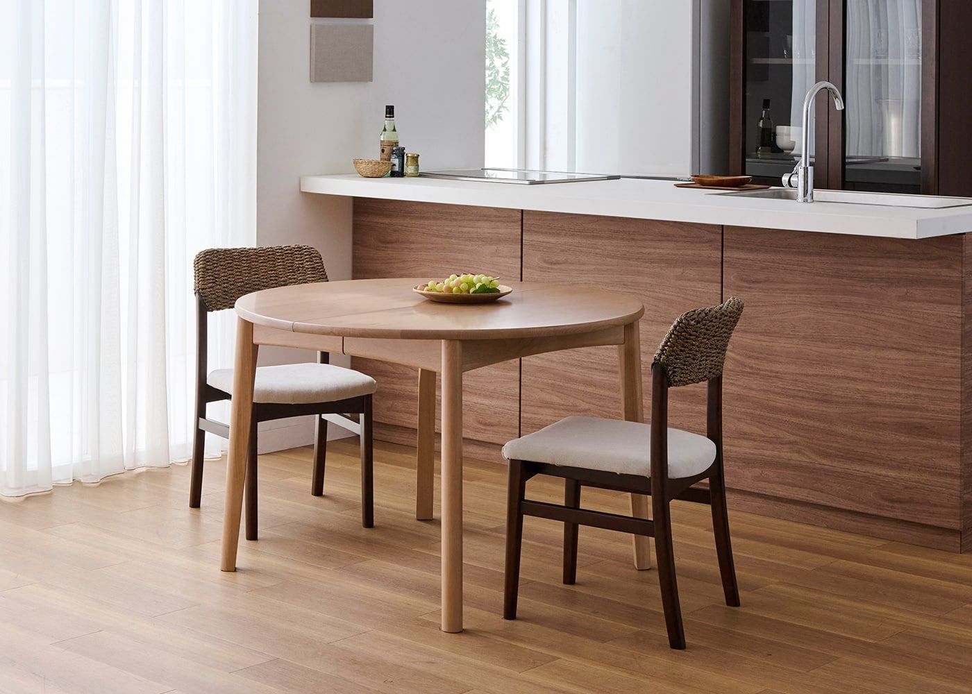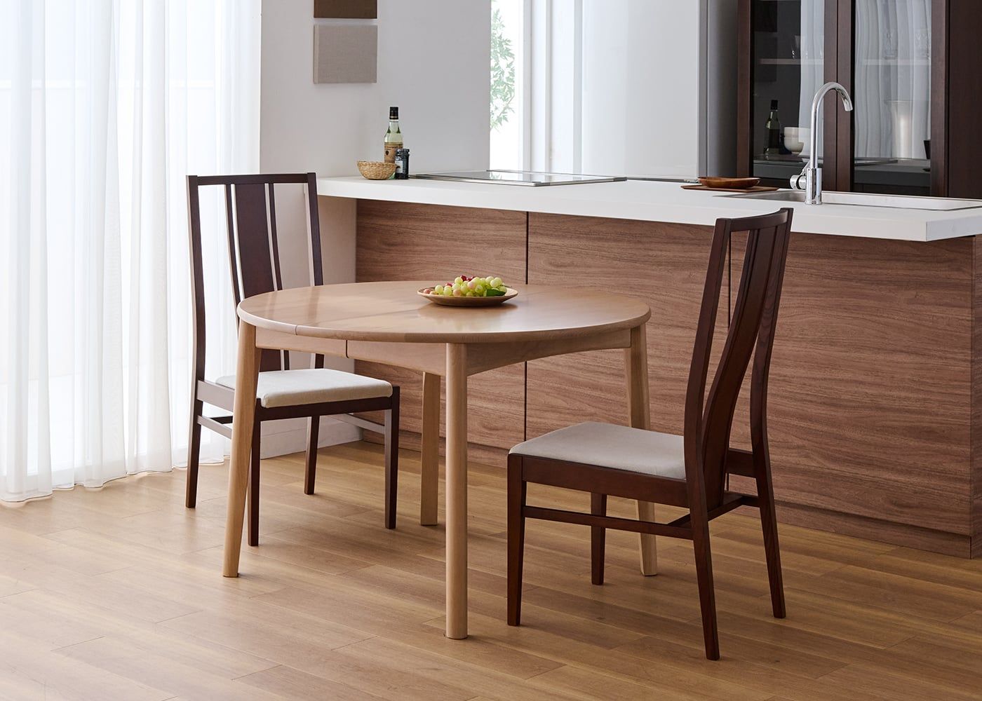 円形ダイニングテーブルは、その柔らかな形状が魅力です。空間に優しげな印象をもたらすとともに、どの席からも相手の顔が見やすく、家族や友人との会話も弾みやすいダイニングを作れます。(写真はエン・伸長式ダイニングテーブル1100(GB) v01、伸長前の幅1100mm)