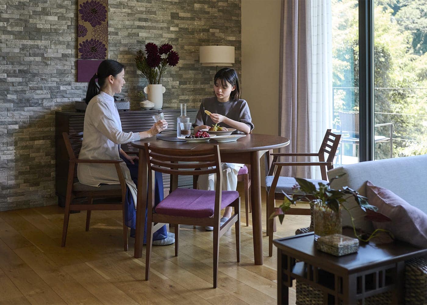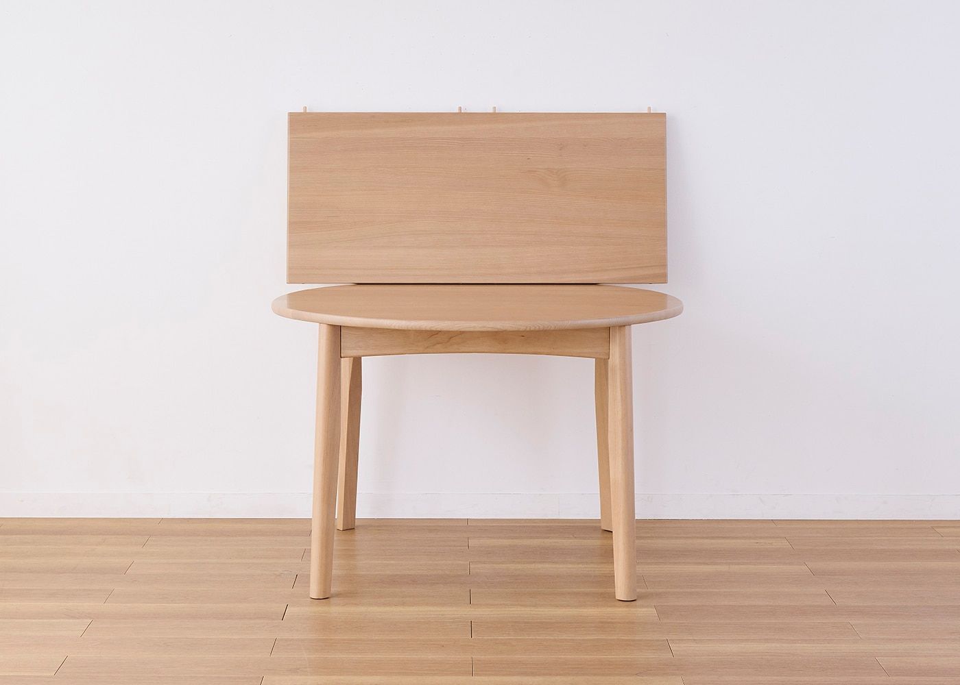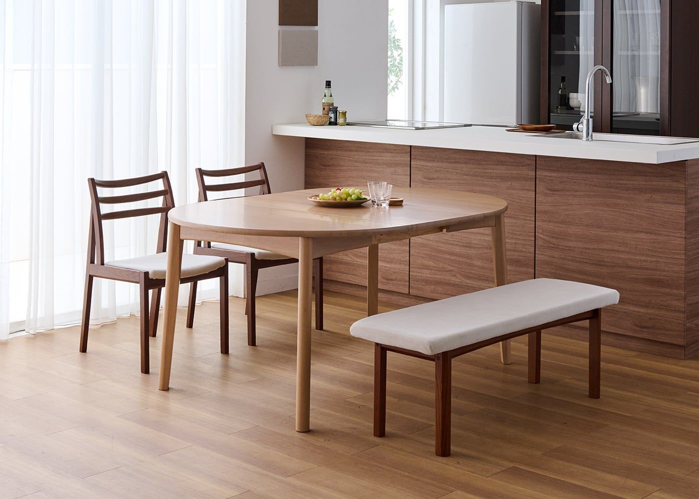 部屋のどこに置いても圧迫感がない、優しい円形デザインが特長です。角がないため伸長後の状態でもダイニングテーブルの存在感を抑え、優しい空気感の中で団らんできます。(写真はエン・伸長式ダイニングテーブル1100(GB) v01、伸長後の幅1600mm)