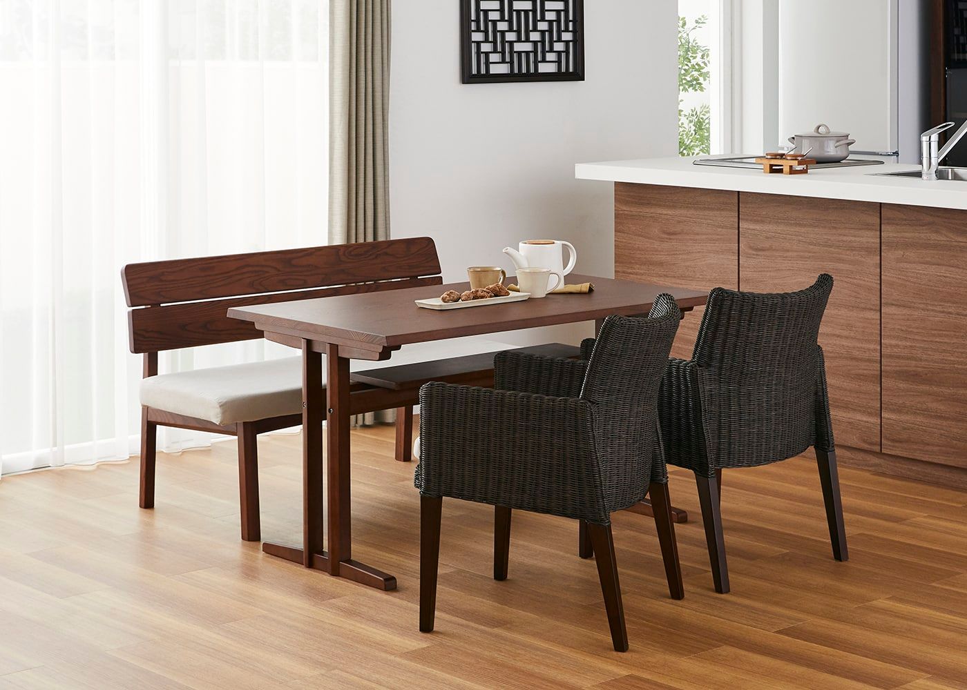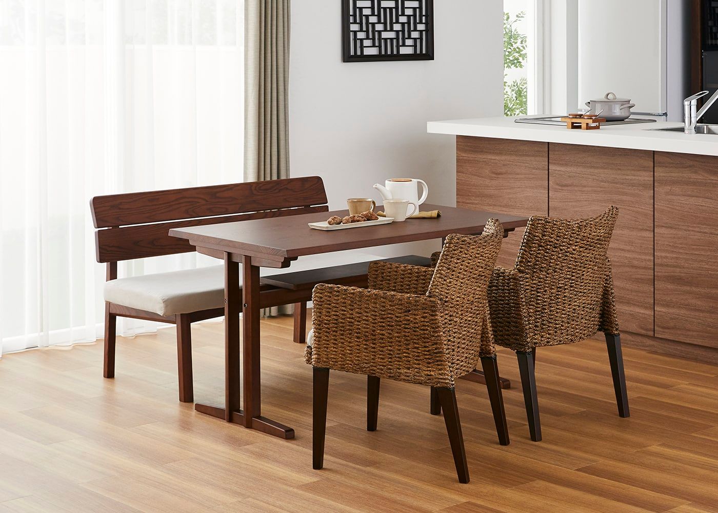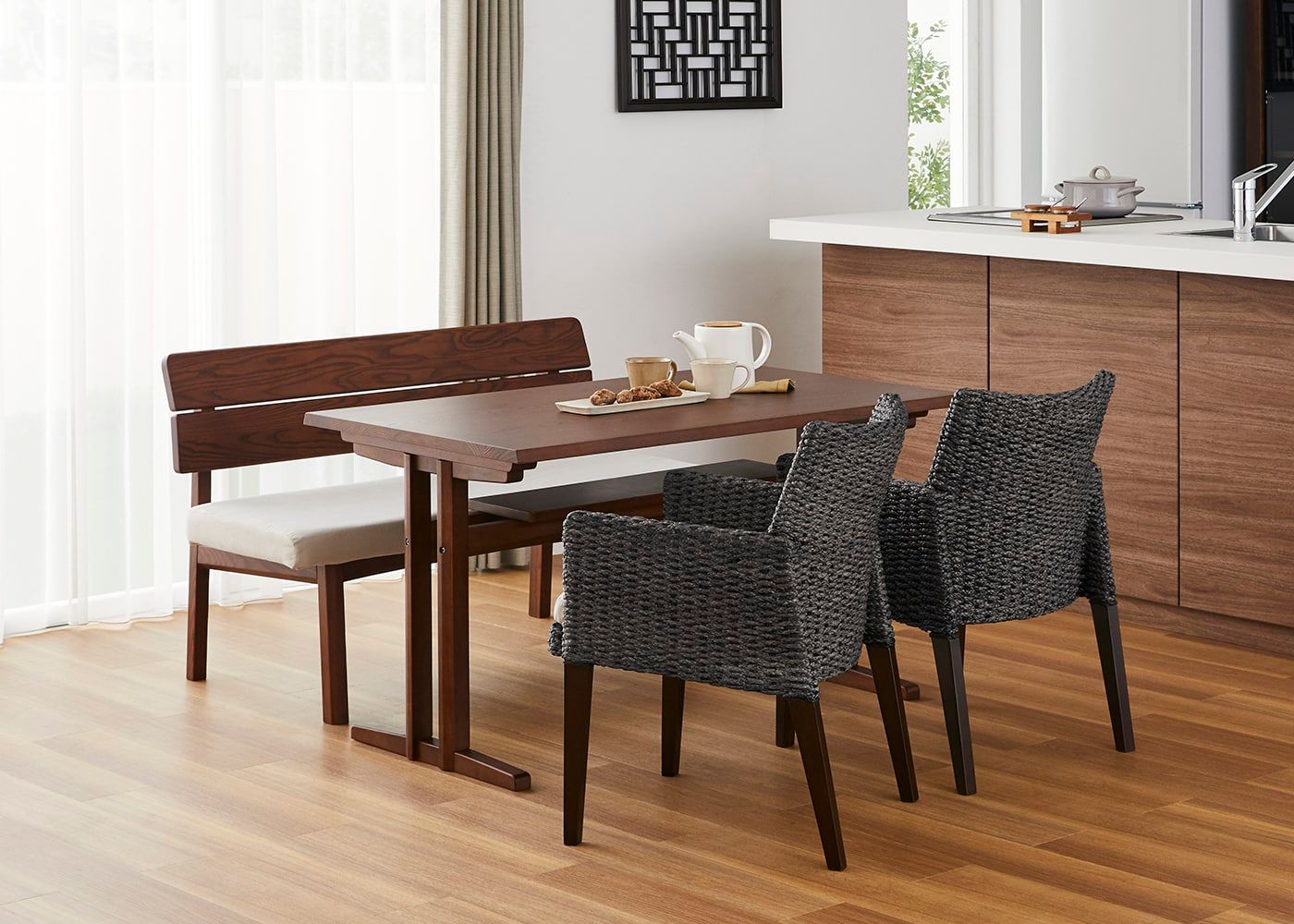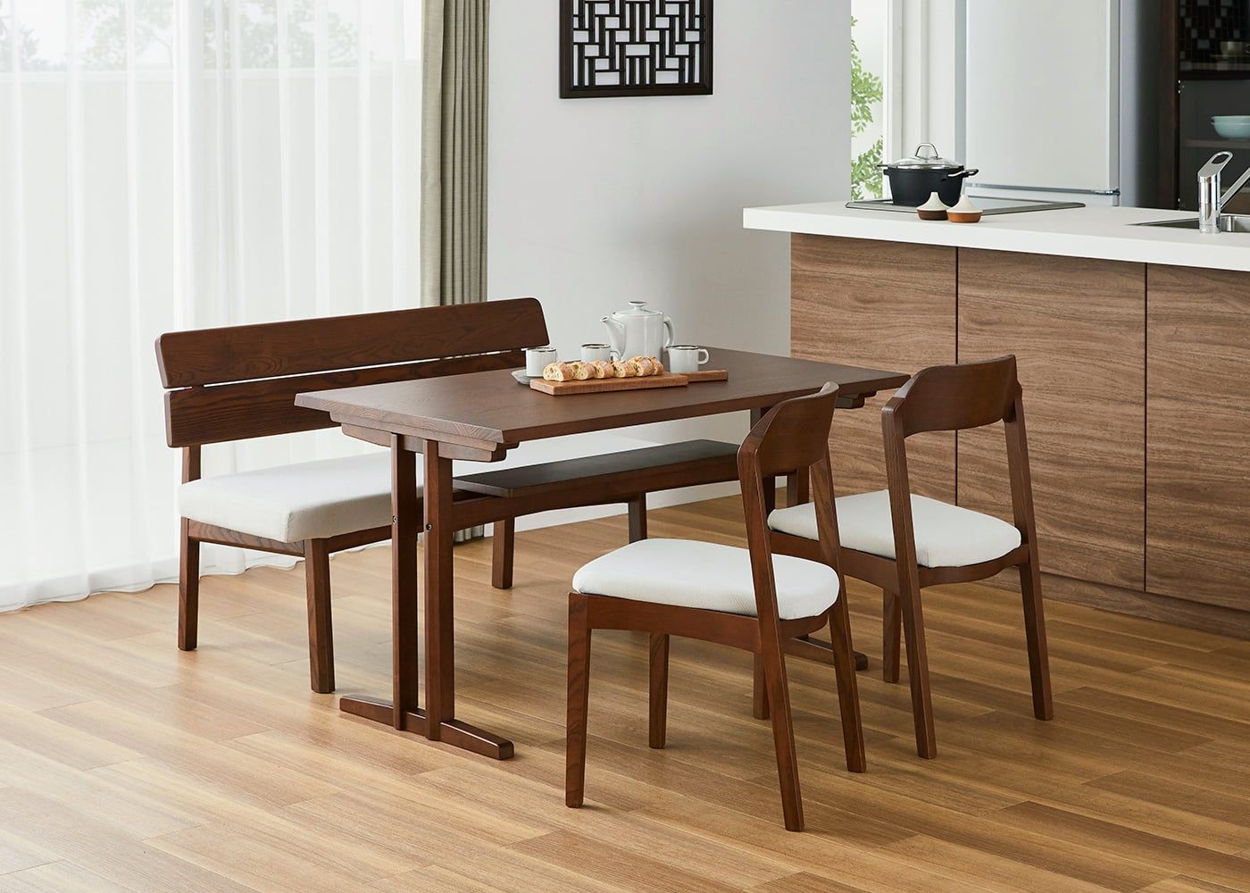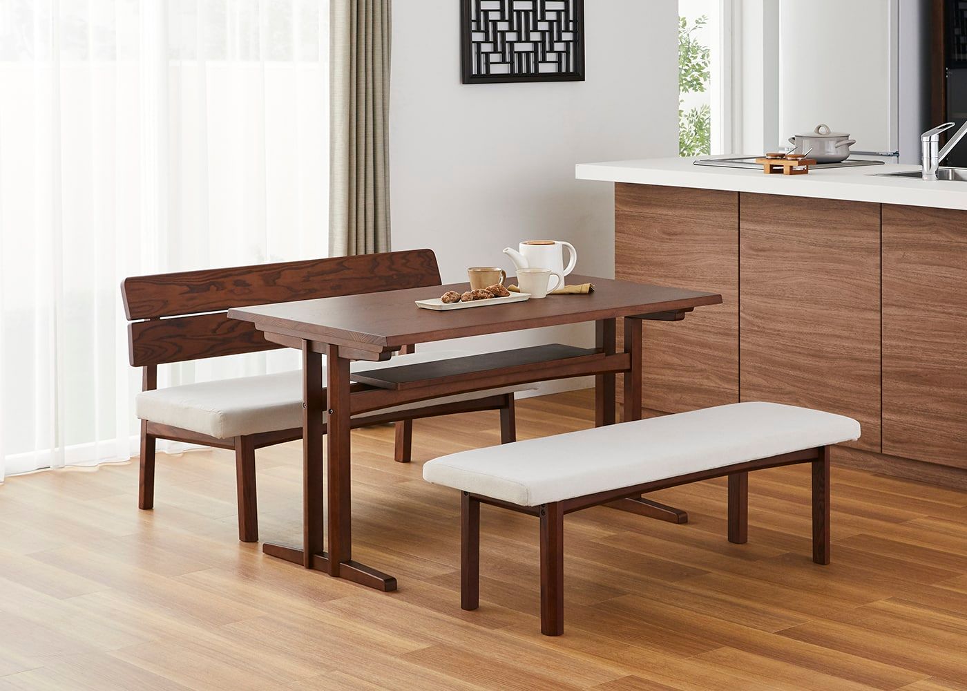 ベンチは座面が広く、大人2人や親子で座ったり、1人の時は贅沢に幅いっぱい使って広々座ることも。こんなダイニングで自由気ままにくつろいでみては。お好みの椅子とのセットをお選び下さい。